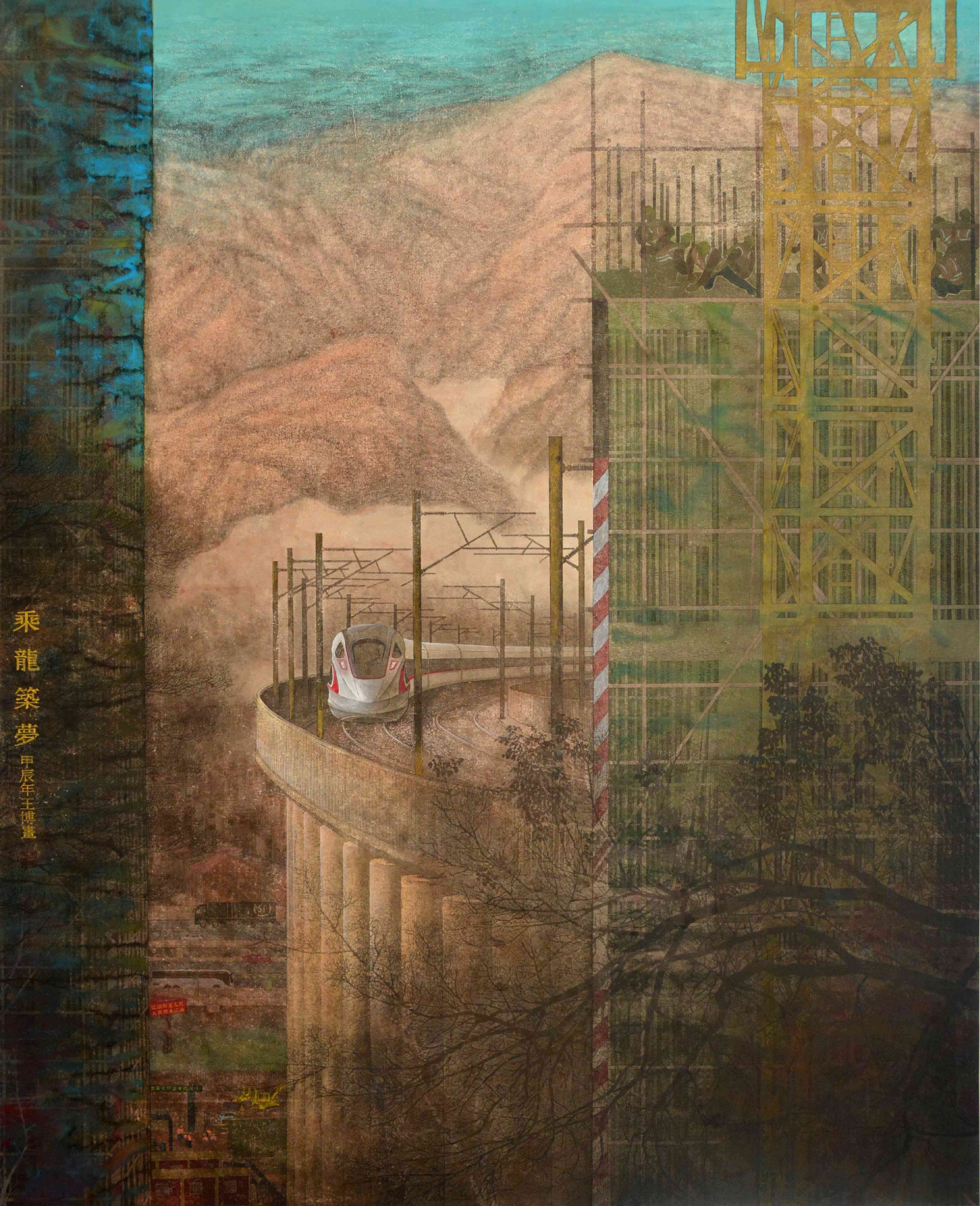 作品全长220cm,宽178cm,以学校校区建设为背景,用面向观者的“S”形铁路横贯画面,将列车作为画面中心,同时将更远处的高速公路移到中景部分,点缀以旅游大巴、快递车辆等具有时代感的元素,将杏花山放置在画面远处增强整体感。