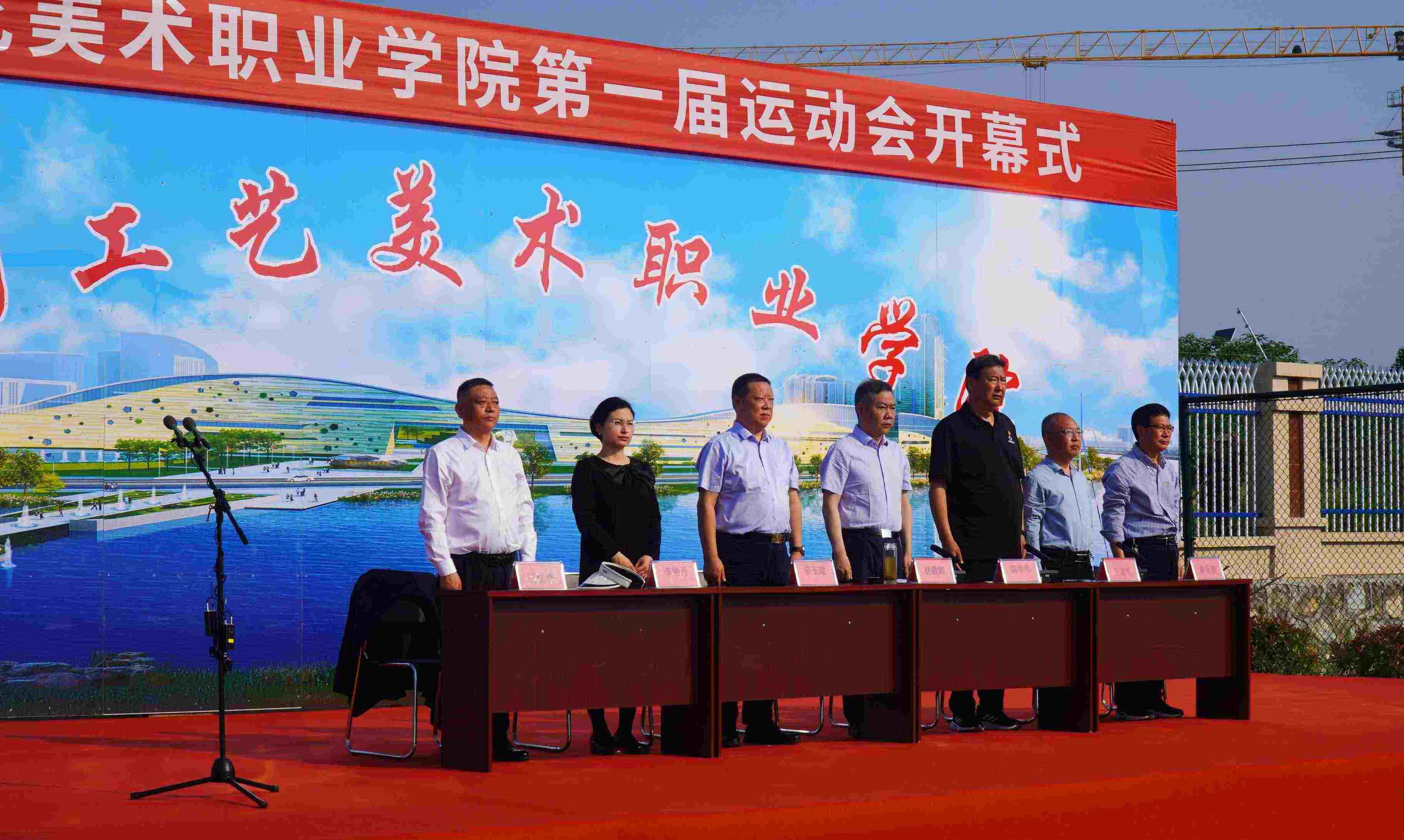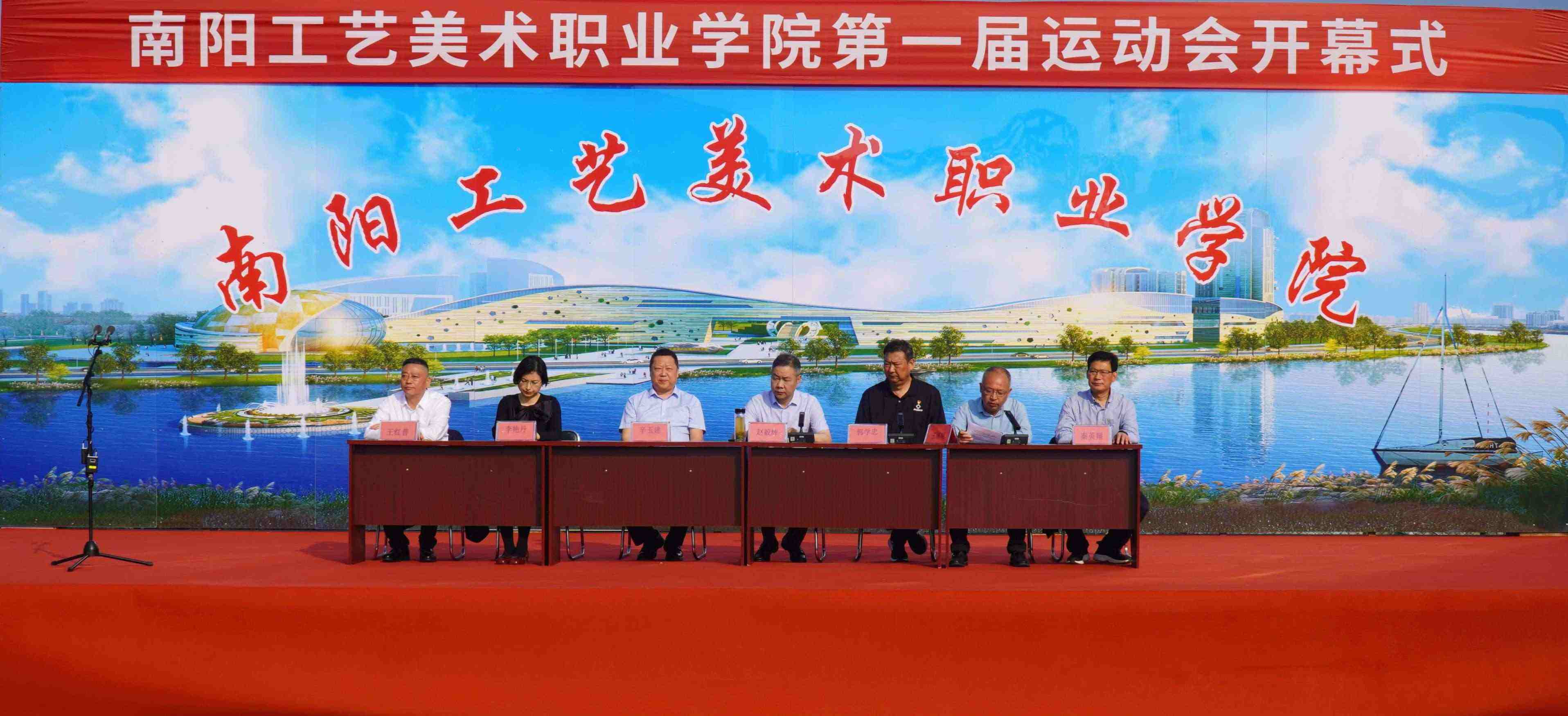 红旗飘扬,掌声雷动。5月7日,伴随着激昂的《运动员进行曲》,南阳工艺美术职业学院第一届田径运动会暨第一届教工运动会在学校田径场盛大开幕!南阳工艺美术职业学院党委书记赵毅辉、副书记郭学中、纪委书记辛玉建、副校长王道明、副校长李艳丹、原镇平县工艺美术中等职业学校校长秦英翔、镇平移动分公司副总经理王红普出席开幕式,全体师生参加了此次开幕式。仪式由副校长王道明主持。