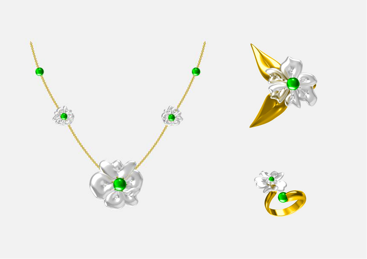 设计说明:本系列首饰设计的创作灵感源自于美丽而神秘的花卉——山荷叶。山荷叶象征着好运,其稀有与美丽使得有幸目睹它的人们被视为极为幸运。山荷叶的花朵精致而小巧,每当雨滴轻触其花瓣,它们便变得透明,显露出内在的纹理,宛如雨中的“水晶花”,光彩夺目。这套首饰巧妙地将自然元素融入设计之中,清新脱俗,为佩戴者带来一种返璞归真的舒适感受。