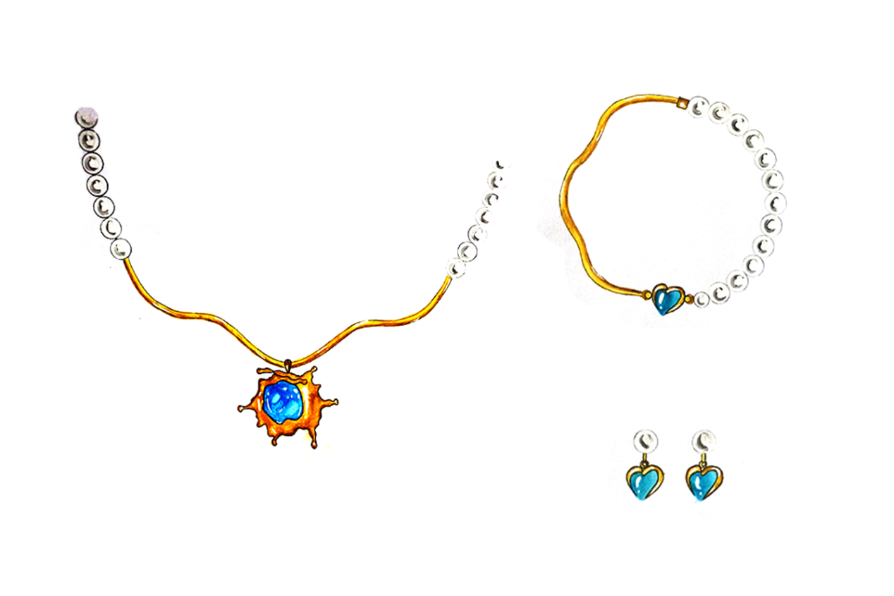 设计说明:本系列珠宝首饰包括项链、手链和耳饰,其设计灵感源自南阳工艺美术职业学院的标志性建筑。珍珠的设计取材于学院展示中心的半圆形结构,蓝宝石则寓意校园中心湖泊的宁静;黄金波浪的设计灵感则来源于从高空俯瞰学院建筑群时所呈现的波浪形态。这三种珍贵材质的巧妙结合,共同承载着对佩戴者深深的祝福。