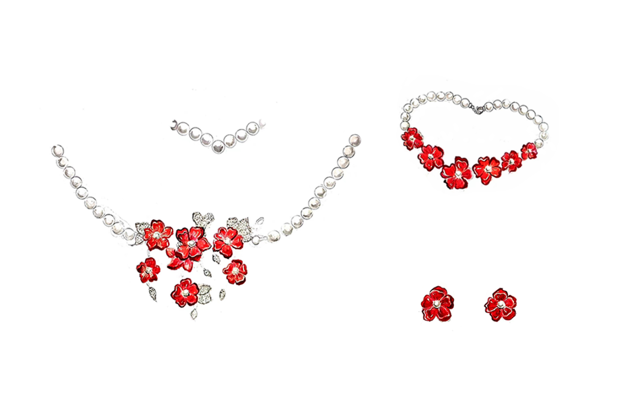 设计说明:红宝石象征着热情与爱情,而珍珠则代表着纯洁与优雅。将这两种珠宝结合,能够传达出一种浪漫而深沉的情感。设计围绕爱情这一主题,采用心形、花朵等元素,以展现爱情的美好与甜蜜。珍珠首饰不仅象征着女性的优雅魅力,红宝石的加入还能增添华丽与高贵的气质,使其成为适合特殊场合佩戴的佳品。整体设计强调女性的柔美与优雅,同时彰显自信与独立。