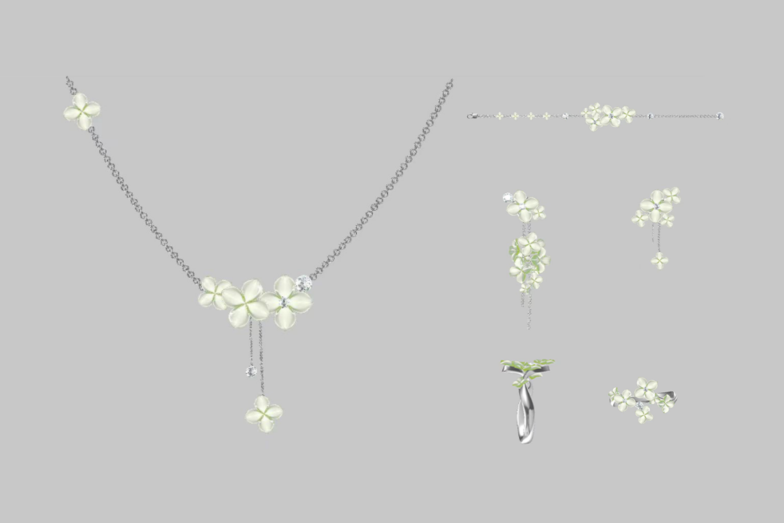 设计说明:本款首饰以白丁香为灵感之源,采用简洁而精致的线条勾勒,创造出纯净无瑕的外观,凸显佩戴者的高雅气质。众多高等学府校园内均可见丁香花的栽种,它象征着优良的校风,寓意着谦逊与勤奋。在首饰的造型设计上,汲取了白丁香的形态与神韵,并巧妙地将其融入首饰创作之中,传递出一种清新宜人的感觉。