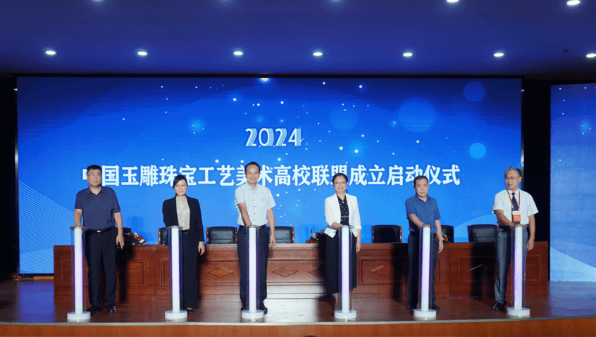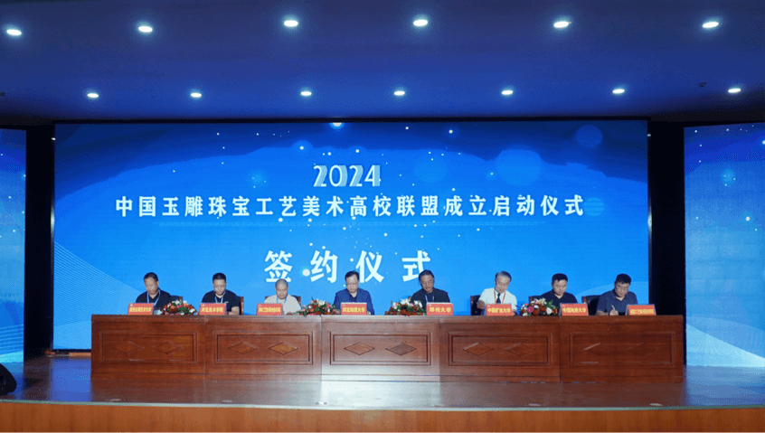 在热烈的掌声中,十五所高校代表依次上台签署了合作协议,标志着中国玉雕珠宝工艺美术高校联盟正式诞生。