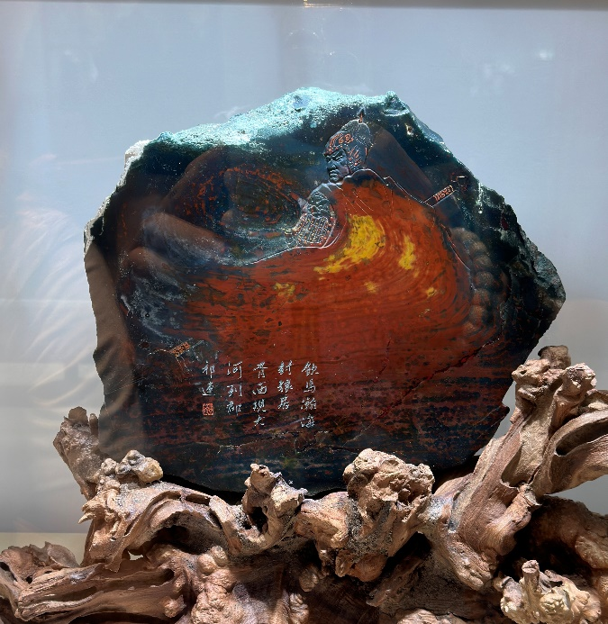 《封狼居胥》·阿拉善玛瑙:画面结构紧凑,布局合理,意境高远,阔达壮美。作品顺色立意,用色自然和谐,呈现了霍去病的英雄气概和拓疆列郡、封狼居胥、扬强汉国威的民族精神。