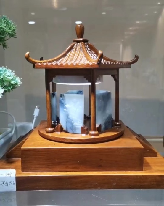 《天之四灵》·和田玉:作品融合西汉四神瓦当、商周时期的饕餮纹和石器时代的回形纹,具有辟邪、守护、镇宅的寓意。采用白、绿两种玉料将图腾加以区分,呈现新颖的视觉效果。
