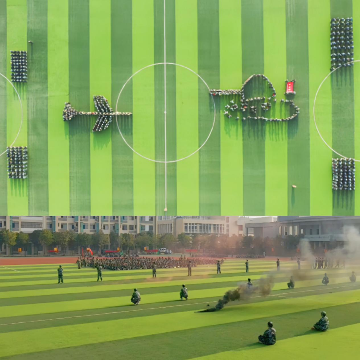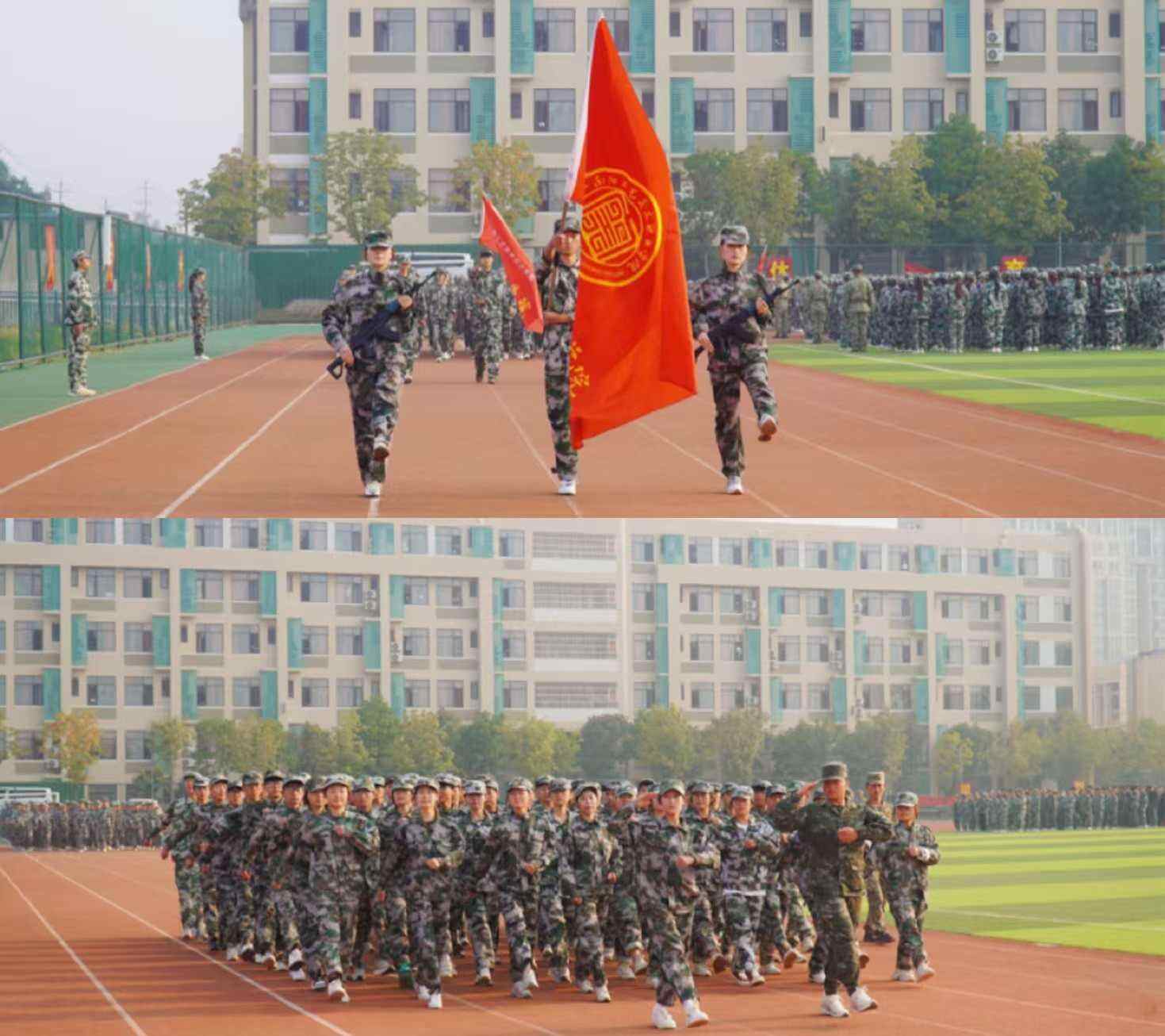 国歌声落,军训会操汇报表演正式开始,新生们展示了十二天的军训成果,他们队列整齐、动作规范,以斗志昂扬的姿态赢得了在场领导和师生们的热烈掌声。
