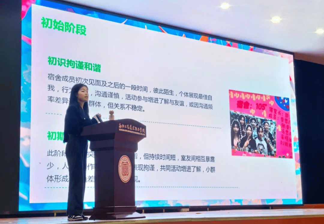 其次,李老师结合专业知识,向同学们介绍了宿舍人际关系的特点和发展历程。其中对人际关系发展历程的介绍,增强了同学们对宿舍矛盾演变的理解。大学生宿舍矛盾最容易出现在磨合阶段。在此阶段,随着宿舍成员之间的交流逐渐增多,话题逐渐广泛,自我暴露更加深入,言谈举止也更加随意,由此造成了“小芥蒂”逐渐演变为“大冲突”。