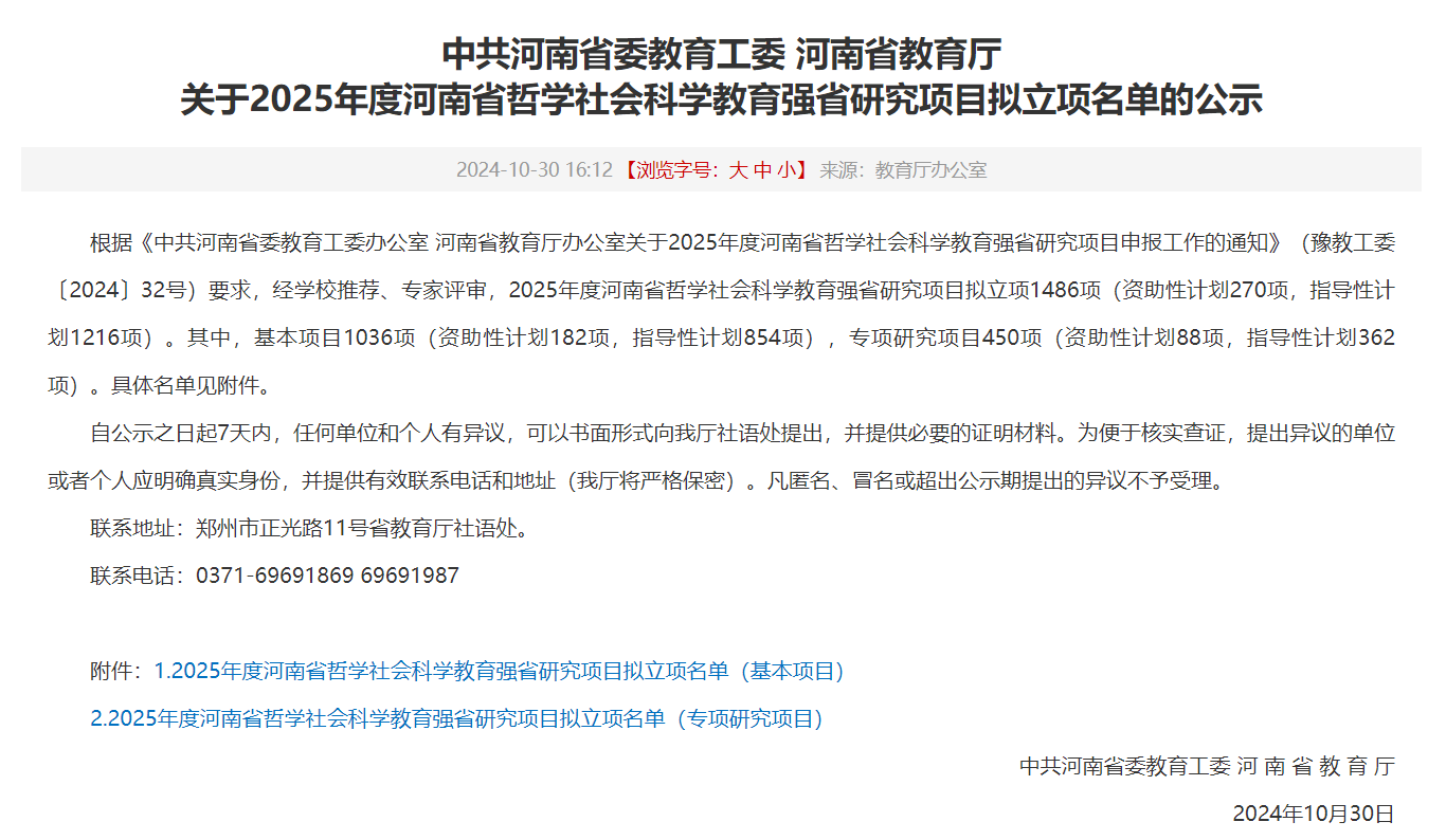 10月30日,中共河南省委教育工委、河南省教育厅联合发布了关于2025年度河南省哲学社会科学教育强省研究项目拟立项名单的公示,我校三项研究获得立项。