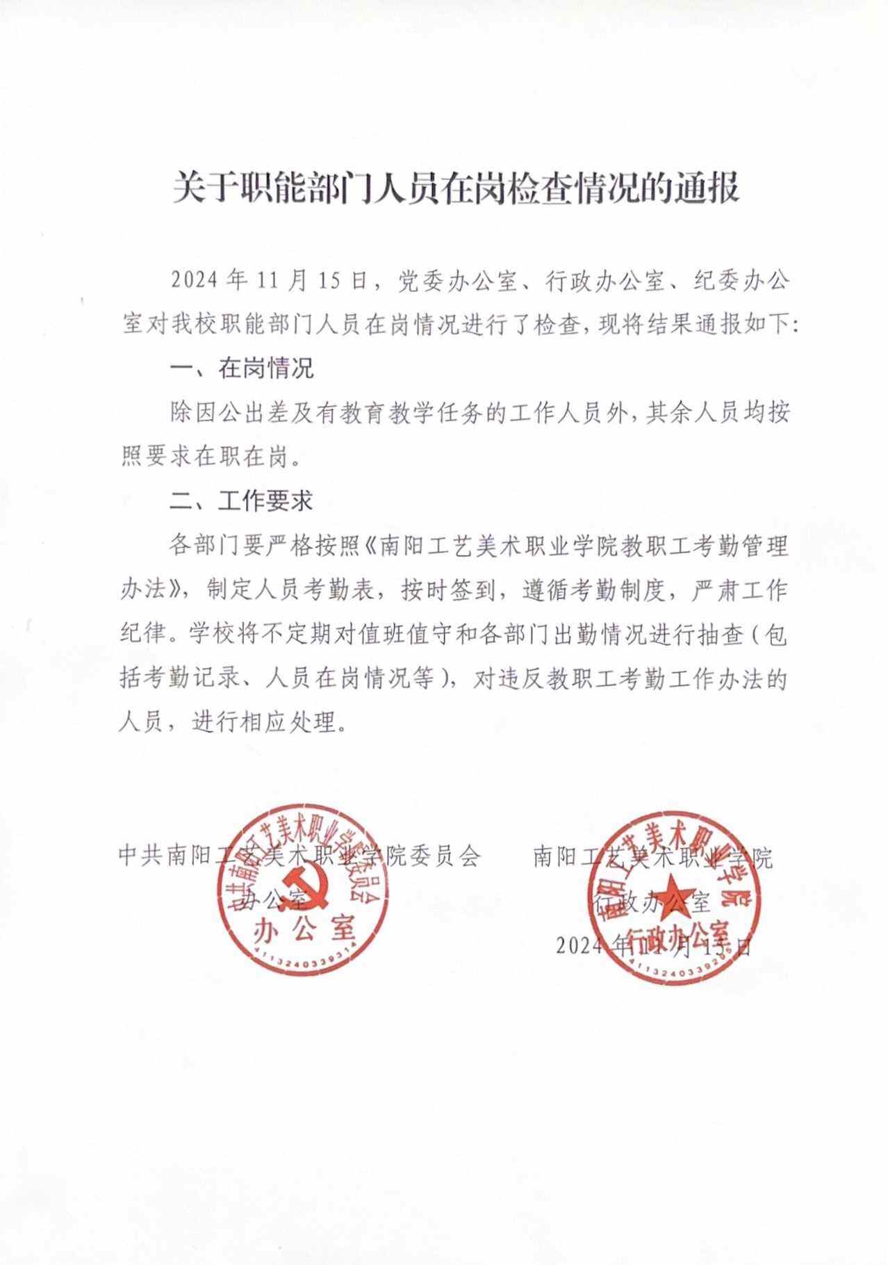 中共南阳工艺美术职业学院委员会办公室、南阳工艺美术职业学院行政办公室关于职能部门人员在岗检查情况通报