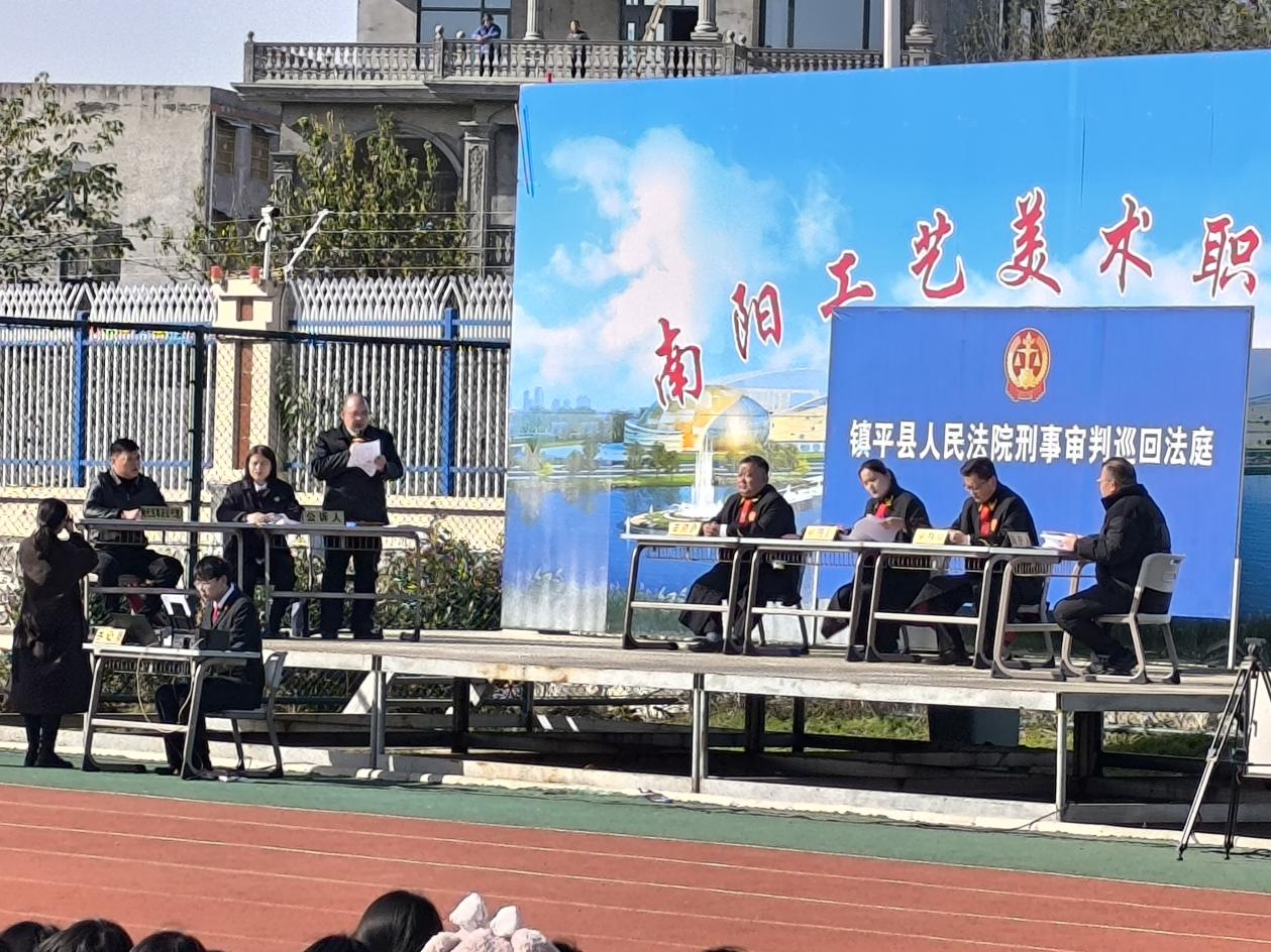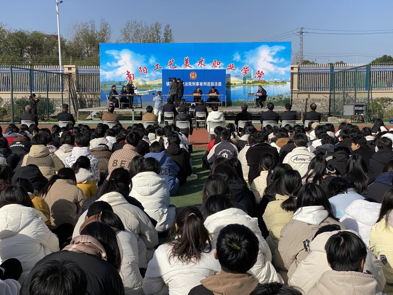 法安天下,德润于心。为深入贯彻习近平法治思想,加强学校师生的法律意识和法治观念。2024年11月27日上午,南阳工艺美术职业学院联合镇平县人民法院在学校开展了一场特殊且意义深远的法治课堂——刑事审判巡回法庭走进校园活动,将庄严肃穆的法庭庭审现场“搬”到了师生们身边。