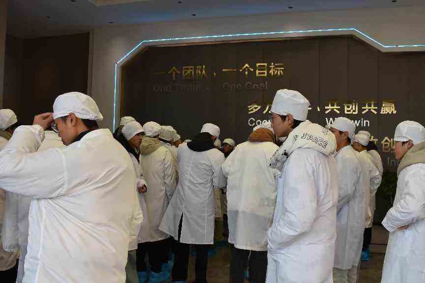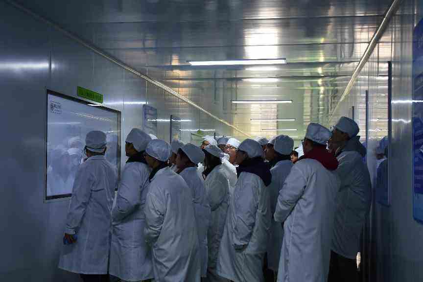 在进入厂区生产车间之前,学生们在厂区员工的带领下更换了无尘服,由厂区总经理助理张迪为学生们讲解带领学生们参观了智能化车间。