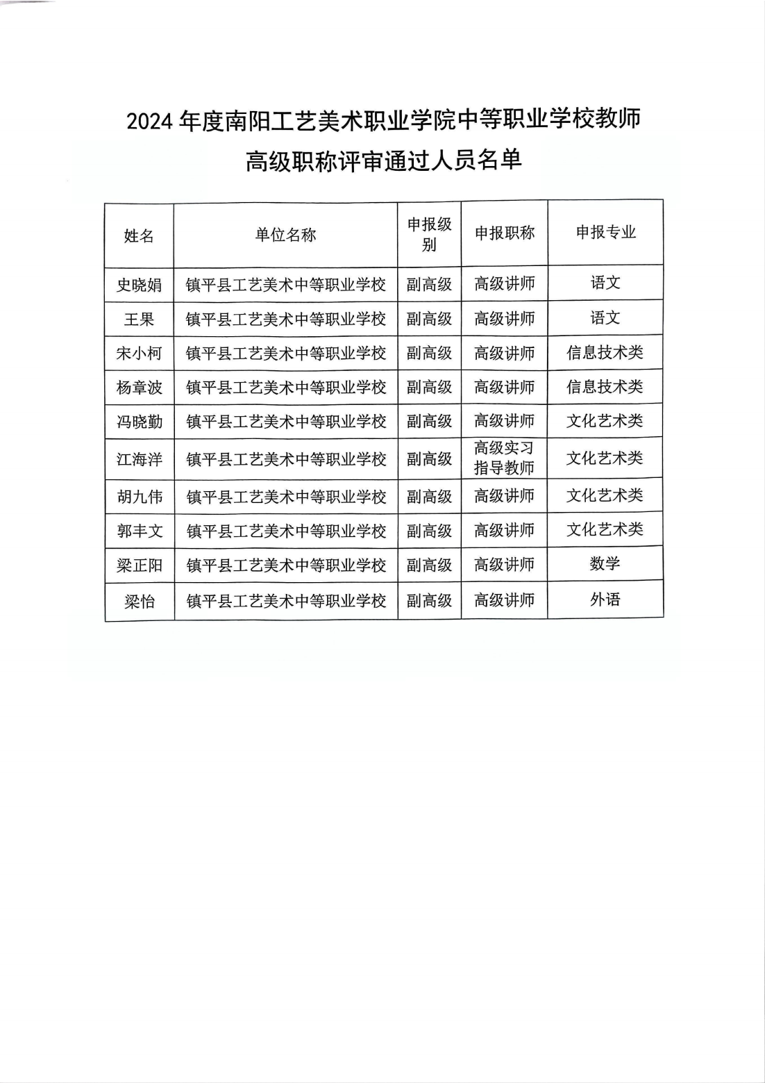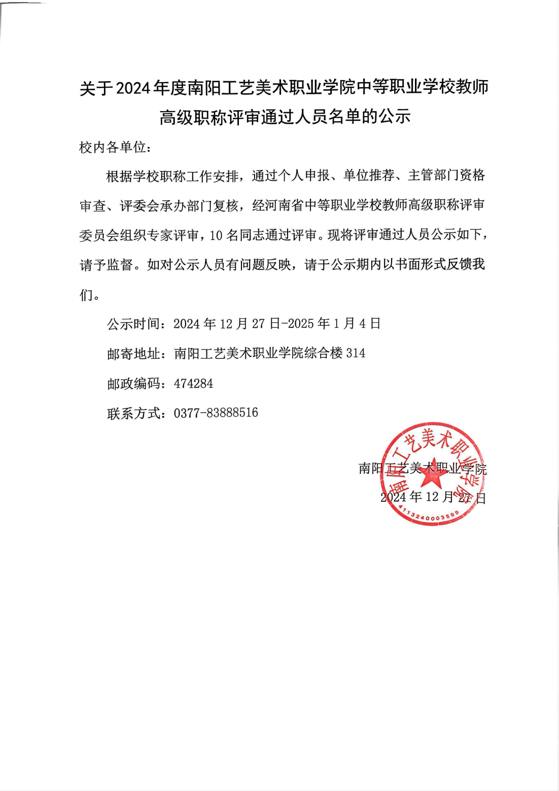 关于2024年度南阳工艺美术职业学院中等职业学校教师高级职称评审通过人员名单的公示