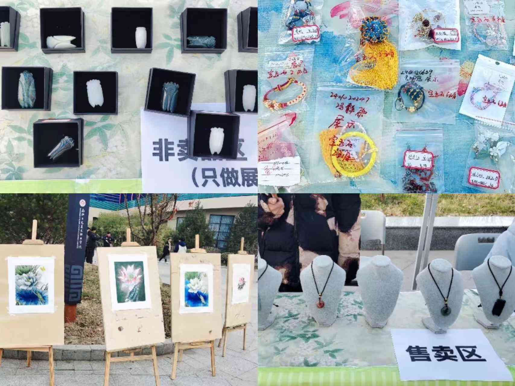 此次市集活动汇聚了玉器设计与工艺、宝玉石鉴定与加工两个专业、不同年级的学生摊主。尽管冬日的清晨寒气袭人,但在活动两日,同学们热情高涨,早早地将帐篷、桌椅、画架等搬运至现场,有条不紊地开展准备工作。在分工协作中,他们精心布置,将学生的中国画作品逐一张贴、完美呈现;各类实训成果,如平安扣、无事牌、八刀蝉、绳艺作品、贵金属首饰以及创意手工等,被标注得清晰明了,错落有致地摆放于售卖区和展览区,方便顾客参观选购。