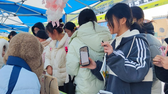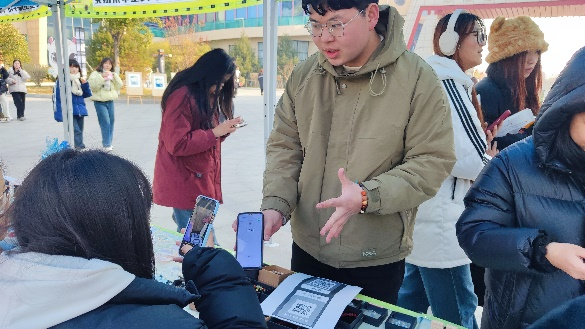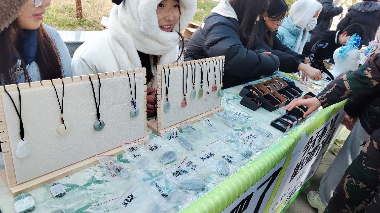 在市集上,各类精美首饰琳琅满目,为冬日的校园增添了一抹亮色。玉器设计与工艺展区,精致细腻的玉石吊坠温润典雅,寓意吉祥的八刀蝉栩栩如生,晶莹剔透的玉石手串散发着美丽光泽。面对络绎不绝的参观者,学生摊主们热情洋溢,详细介绍每件作品的材质、工艺和文化内涵等。他们的专业讲解与真诚态度吸引了众多师生驻足,不少人为心仪的作品欣然买单。