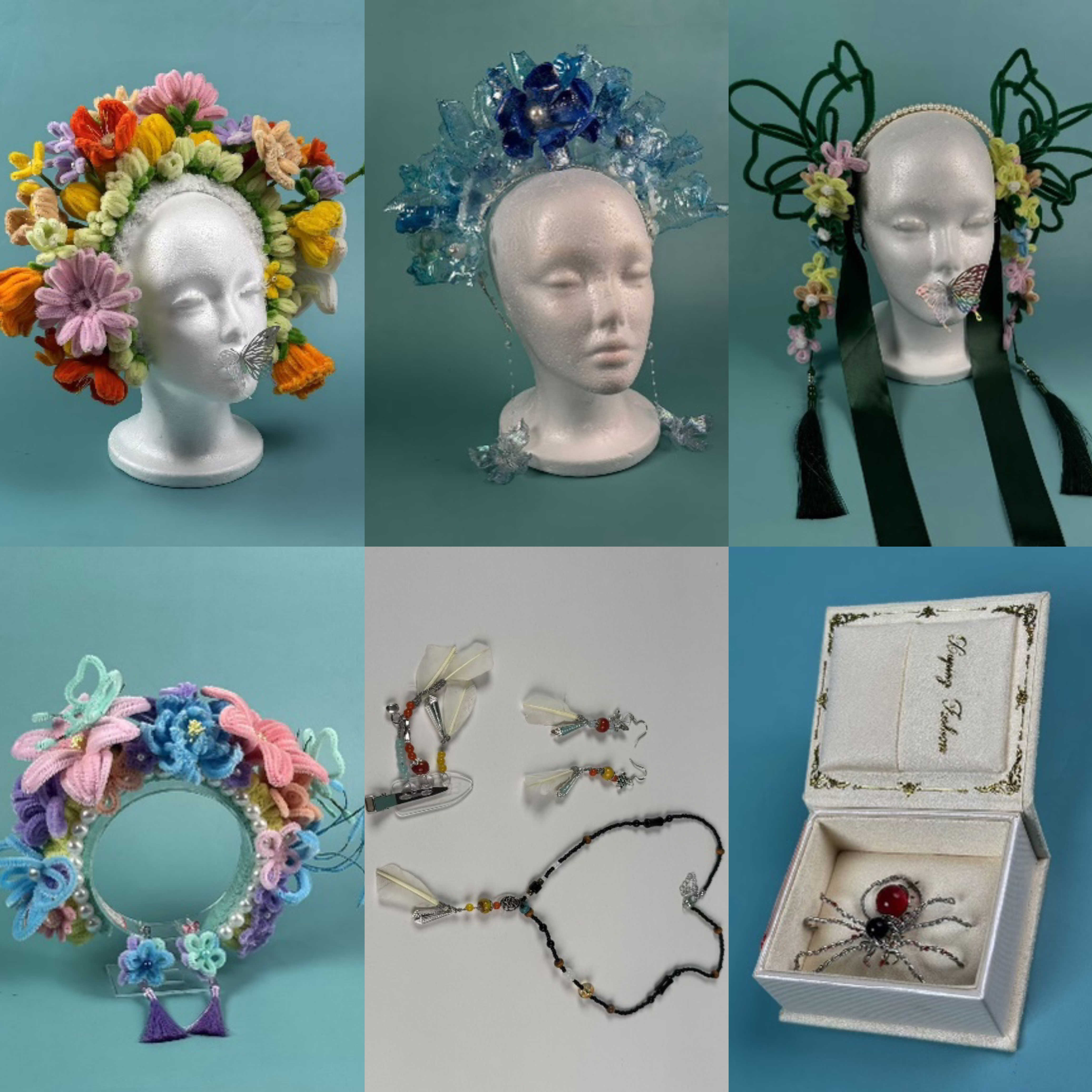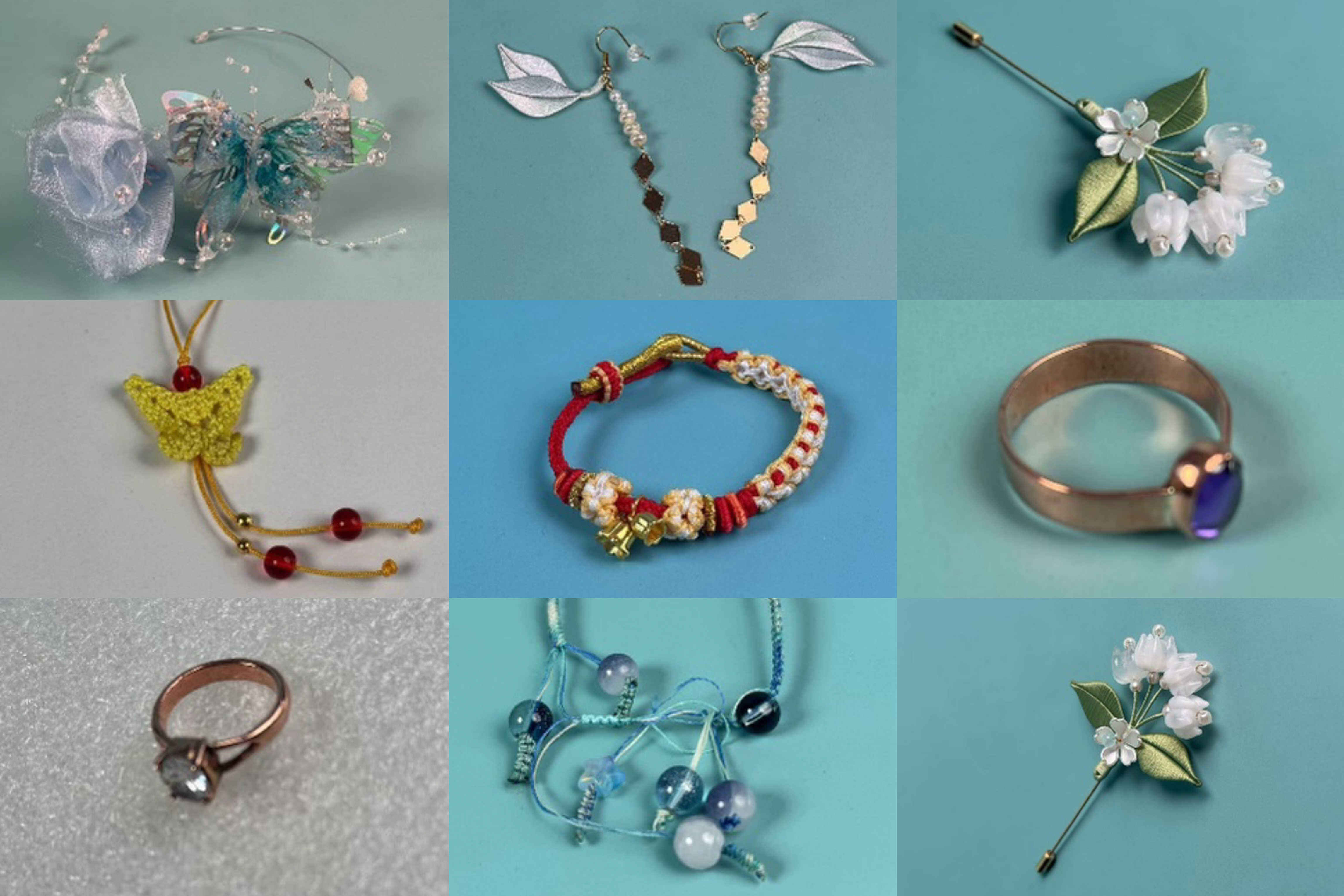 除了玉石作品,现场还有散发着古典韵味的花卉系列中国画,构思奇巧的创意手工编绳、精美典雅的非遗缠花、绚丽明艳的簪花头饰等,更有工艺精湛的贵金属吊坠、戒指、耳饰、胸针等上百种作品。这些作品不仅展现了我院学子卓越的动手能力和对艺术的热爱,更洋溢着青春的蓬勃朝气,将中国传统文化之美和手工创意的独特魅力展现淋漓尽致。