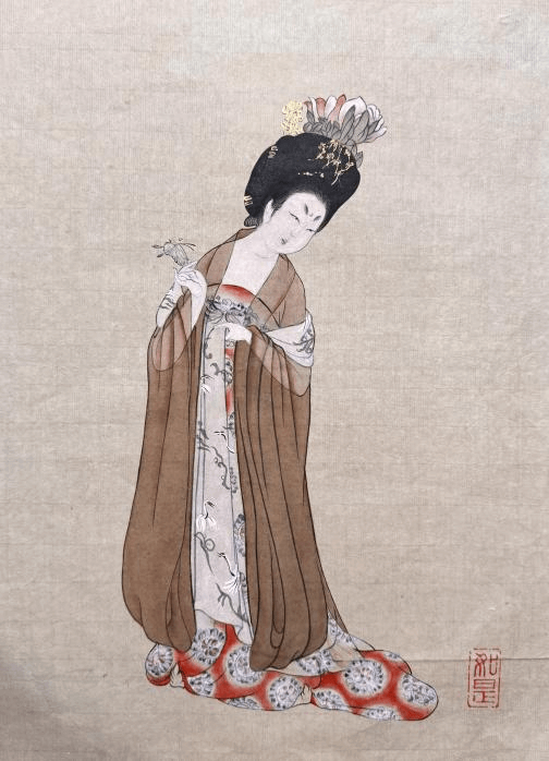 经典赏析:图中仕女髻插芍药花,身披浅紫纱衫,束裙的宽带上饰有鸳鸯图案,白地帔子绘有彩色云鹤。她右手举着刚刚捉来的蝴蝶。于丰硕健美中,又显出窈窕婀娜之姿。