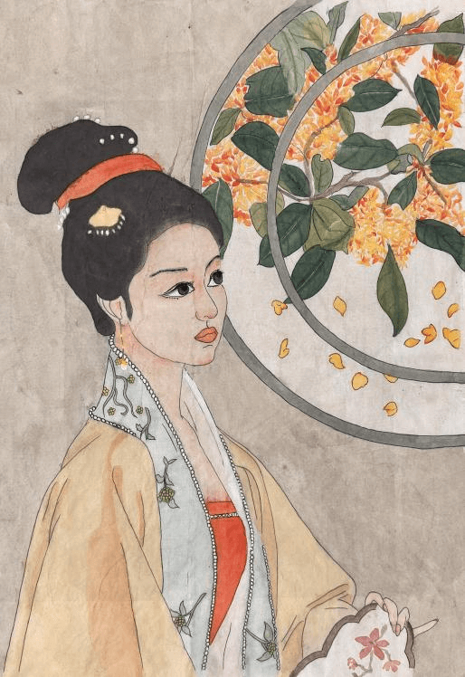 原作解读:这幅画展现了一位身着传统服饰的女子,她优雅地手持团扇,背景中的桂花增添了一抹秋日的韵味。
