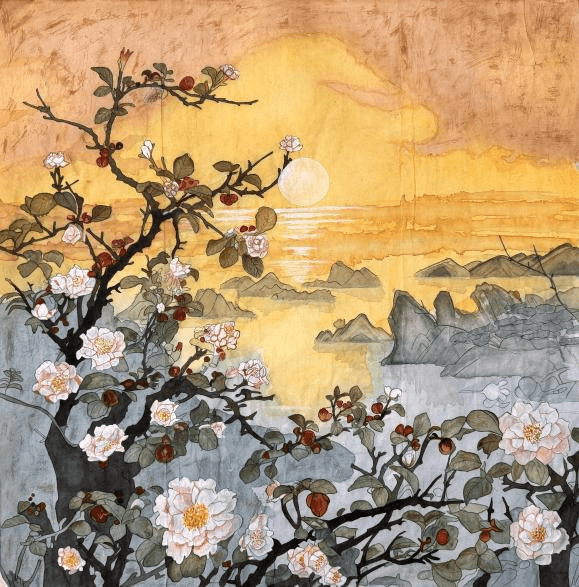 原作解读:画面中,夕阳的余晖将天空染成金黄,那温暖的色调仿佛是在天际留下的最后一抹绚烂。余晖洒在山峦和湖面上,与盛开的繁花相映成趣,营造出一种宁静而美好的氛围。