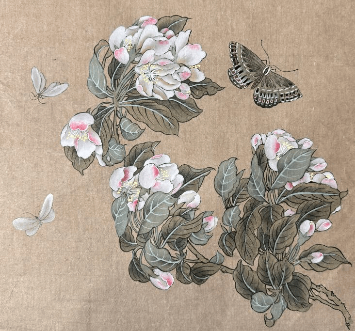学生心语:娇艳的海棠、飞舞的彩蝶、随风翻卷的花叶点染出浓浓的春意,呈现出一派暖风熏醉的气象。