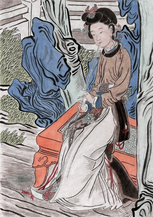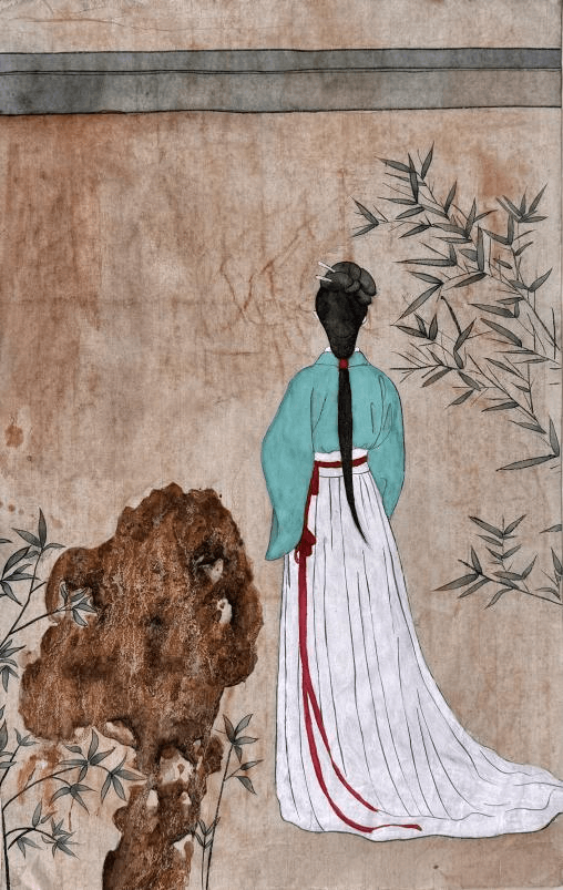 原作解读:一位仕女在隔墙眺望,她在思念远方的家人,同时也对未来生活充满期待。