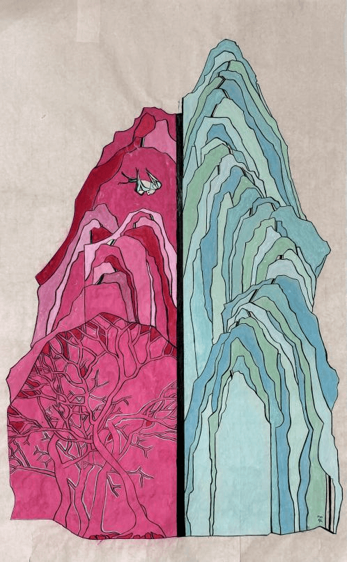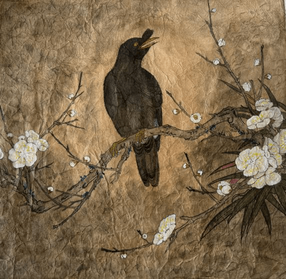 学生心语:梅枝苍劲,红梅傲雪,尽显坚韧不屈之态。八哥灵动鲜活,为画面添生机。二者相映成趣,似闻寒香鸟语。