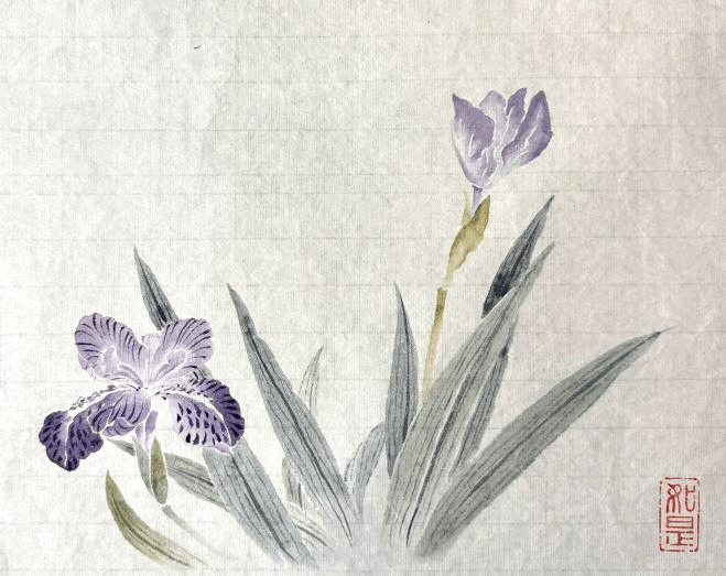 经典赏析:鸢尾花的形态优美,色彩浓艳,尤其是花瓣的造型常常被用来作为栩栩如生的绘画细节,让整幅画卷更加精细细致。钟情工笔倾热爱,传承艺术耀光芒。