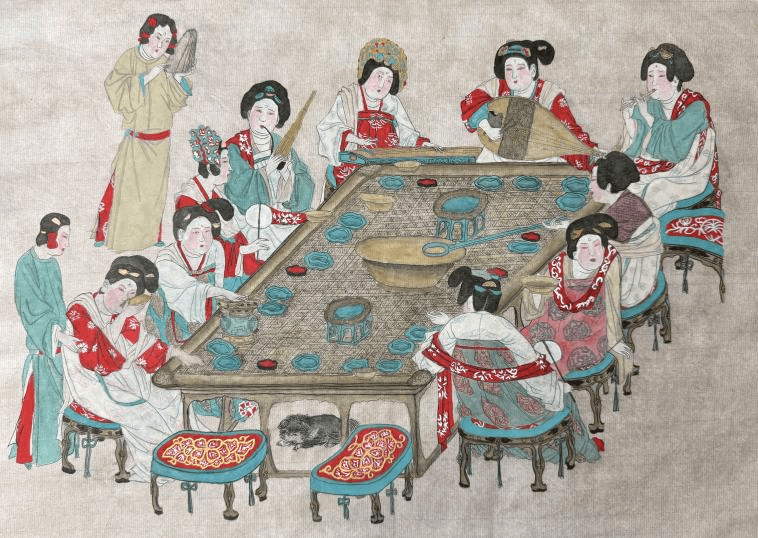 经典赏析:图描写后宫嫔妃十人,围坐于一张巨型的方桌四周,有的品茗,也有的在行酒令。还有一人轻敲牙板,为她们打着节拍。从每个人脸上陶醉的表情来推想,席间的乐声理应十分优美,因为连蜷在桌底下的小狗,都未被惊扰到!
