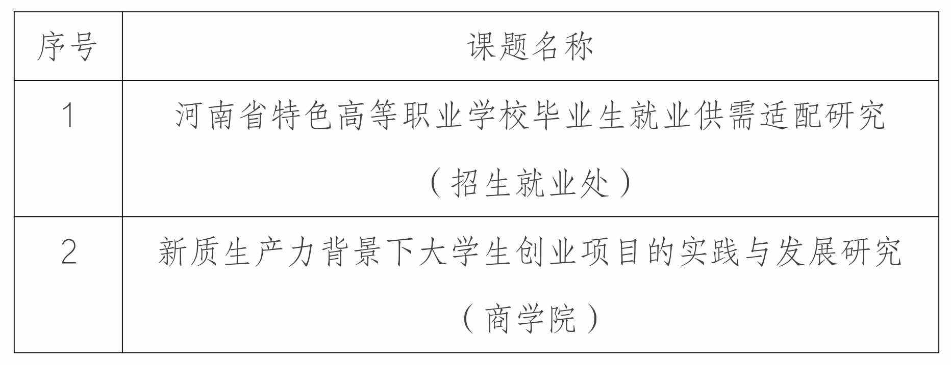 为深入贯彻落实《中共中央办公厅国务院办公厅关于加快构建普通高等学校毕业生高质量就业服务体系的意见》,深化高校毕业生就业研究,加强就业研究成果培育和应用。我校积极参与河南省教育厅《关于做好2025年全省普通高校就业创业课题立项工作的通知》课题申报活动。经个人申报、学院推荐、教务科研部审核、专家评审,现将评审胜出结果公示如下: