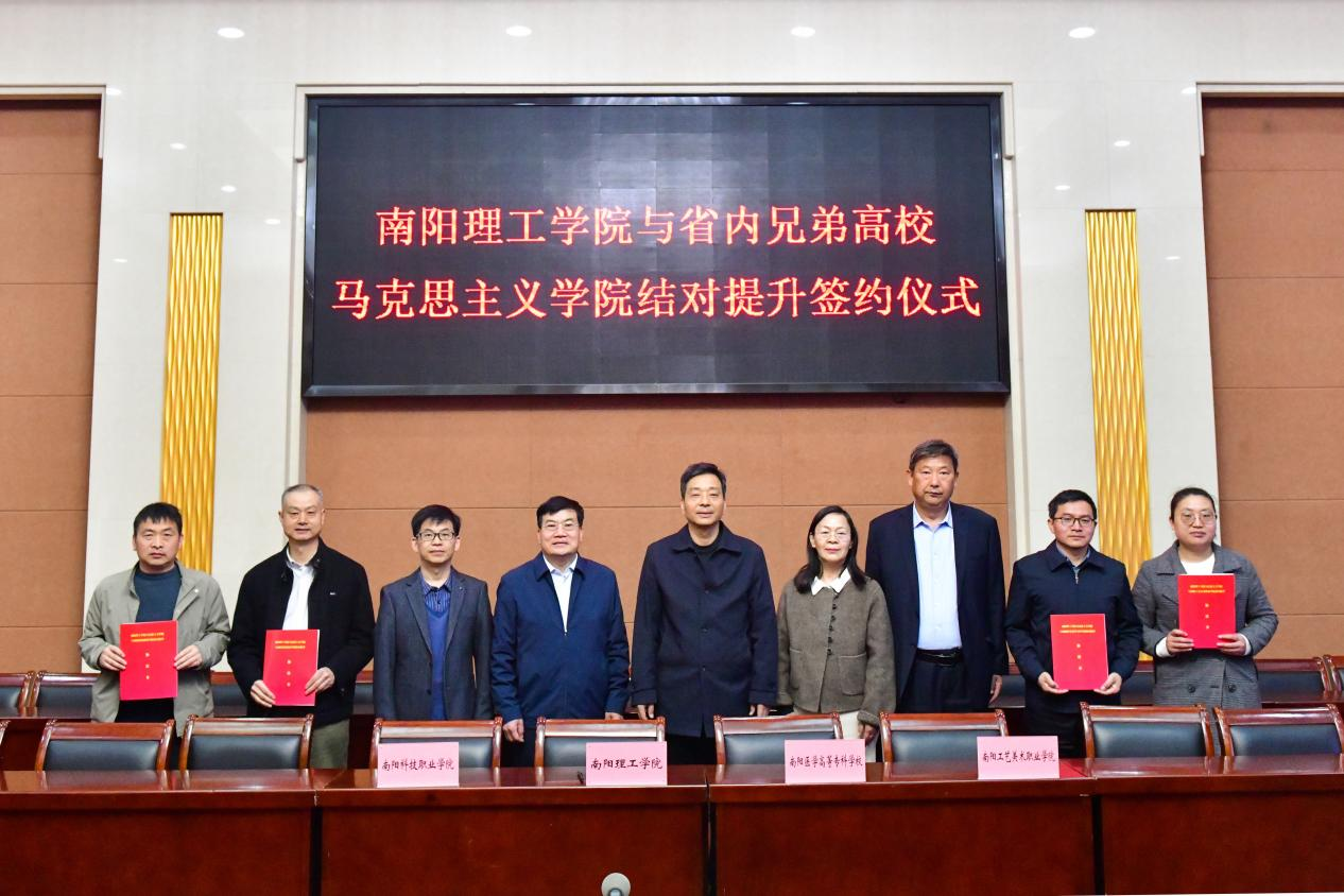 为全面贯彻落实习近平总书记关于思想政治理论课建设的重要指示和党的二十届三中全会精神,进一步发挥省级示范性马克思主义学院的辐射引领作用,根据《中共河南省委宣传部、中共河南省委教育工委、河南省教育厅关于印发<河南省高校马克思主义学院结对提升工作方案>的通知》(豫教工委[2024]175号)要求,3月31日,在南阳理工学院会议中心举行了我校马克思主义学院与南阳理工学院马克思主义学院结对提升仪式。校党委副书记郭学中,马克思主义学院副院长周密参加仪式。