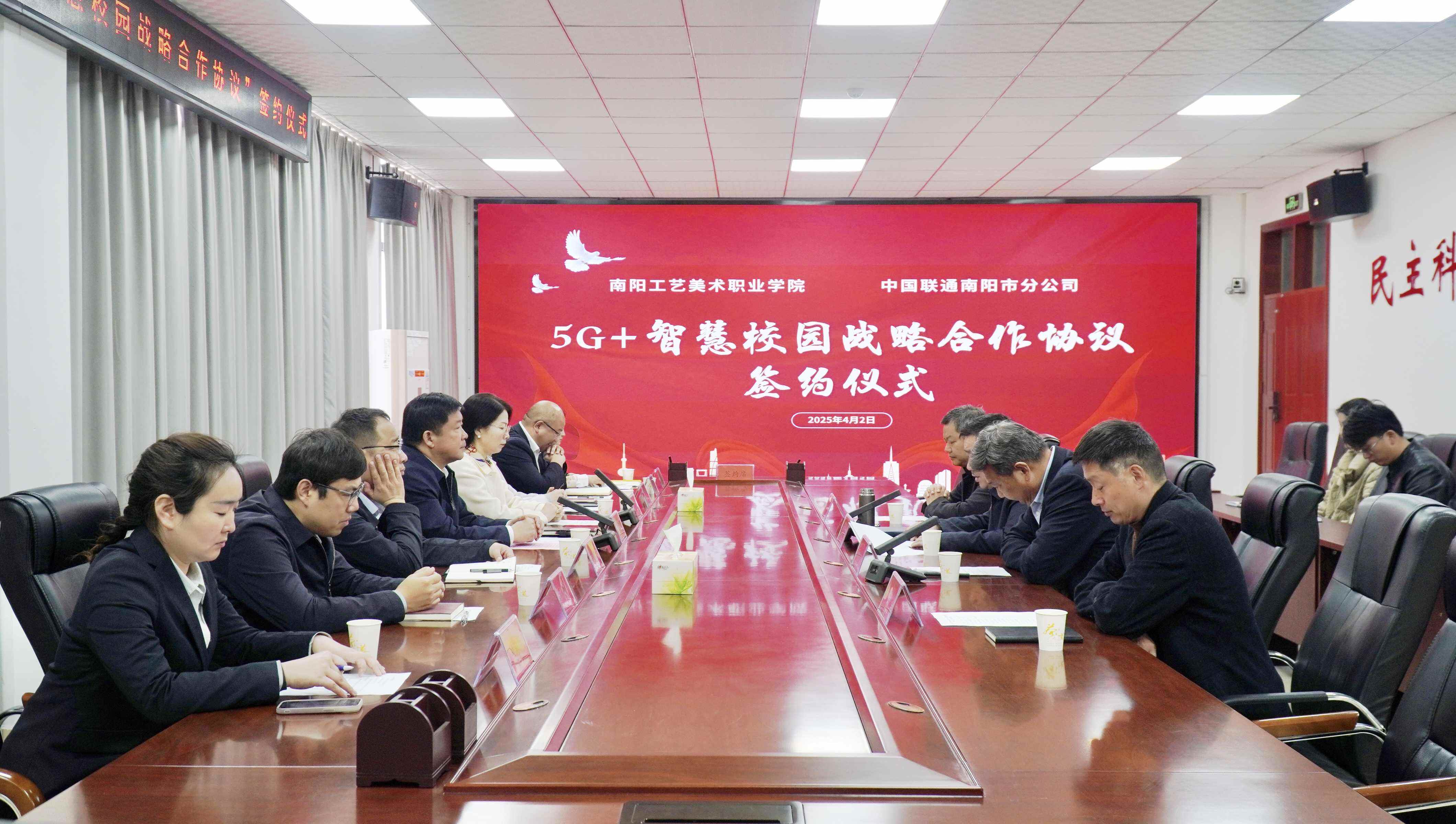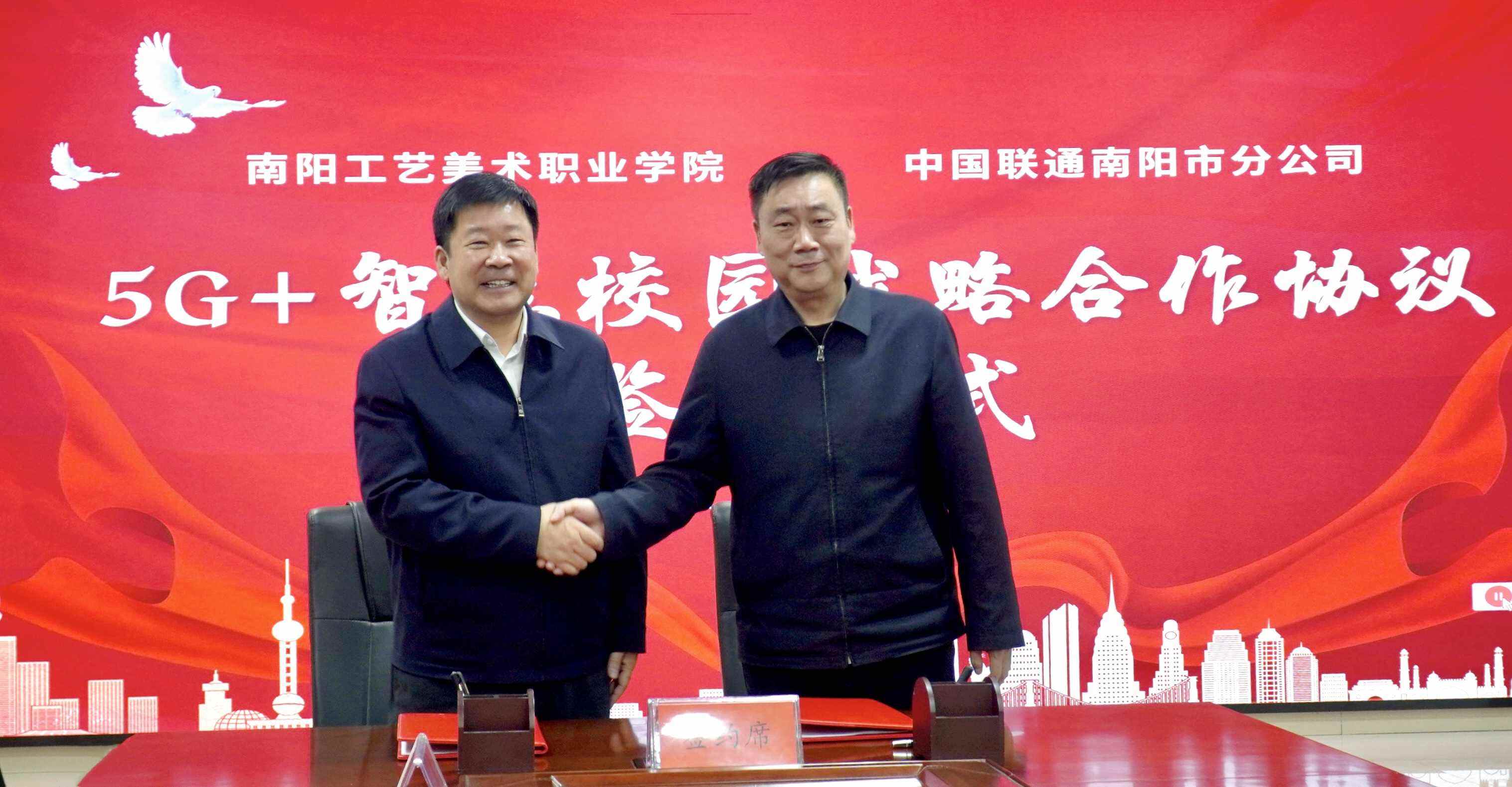4月2日,我校与中国联合网络通信有限公司南阳市分公司举行“5G+智慧校园战略合作协议”签约仪式。中国联通南阳市分公司党委书记、总经理朱智勇,党委委员、副总经理肜静等出席会议,校长胡楠、党委副书记郭学中及我校相关部门负责人共同参会。