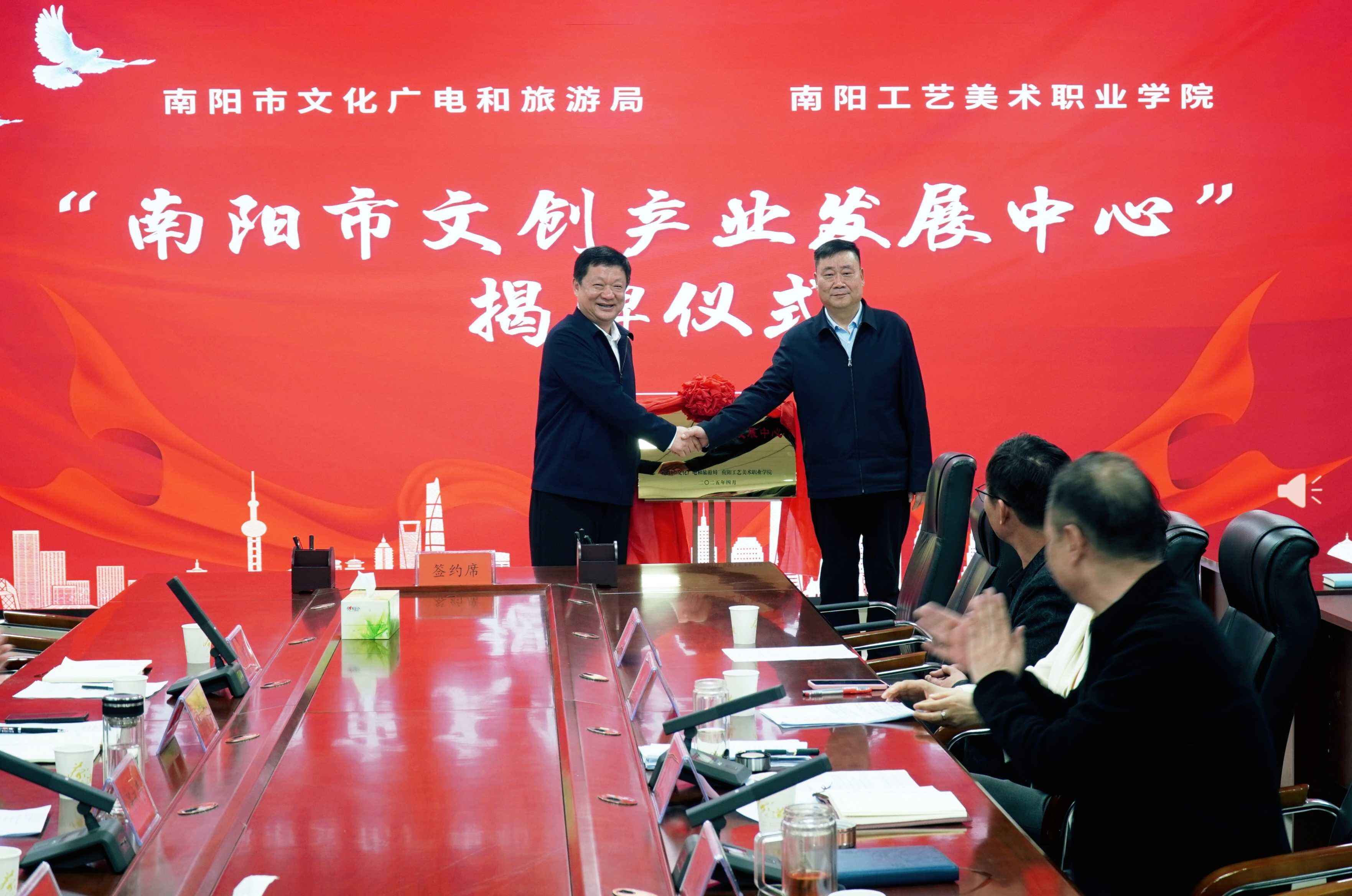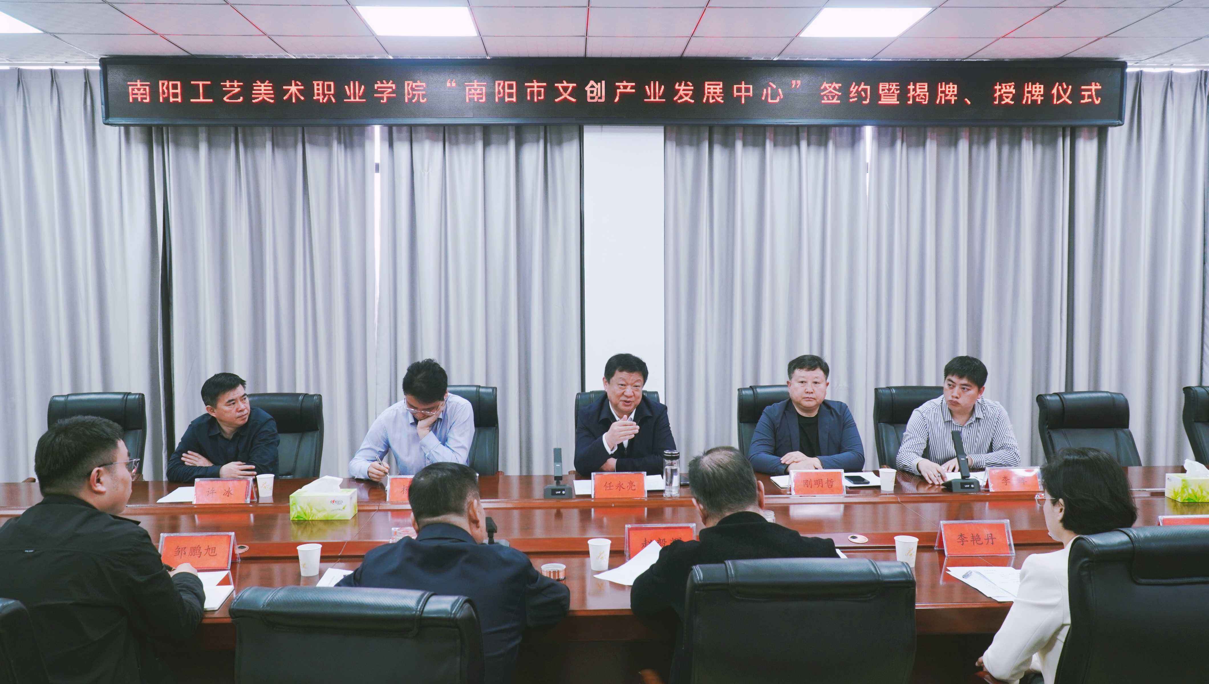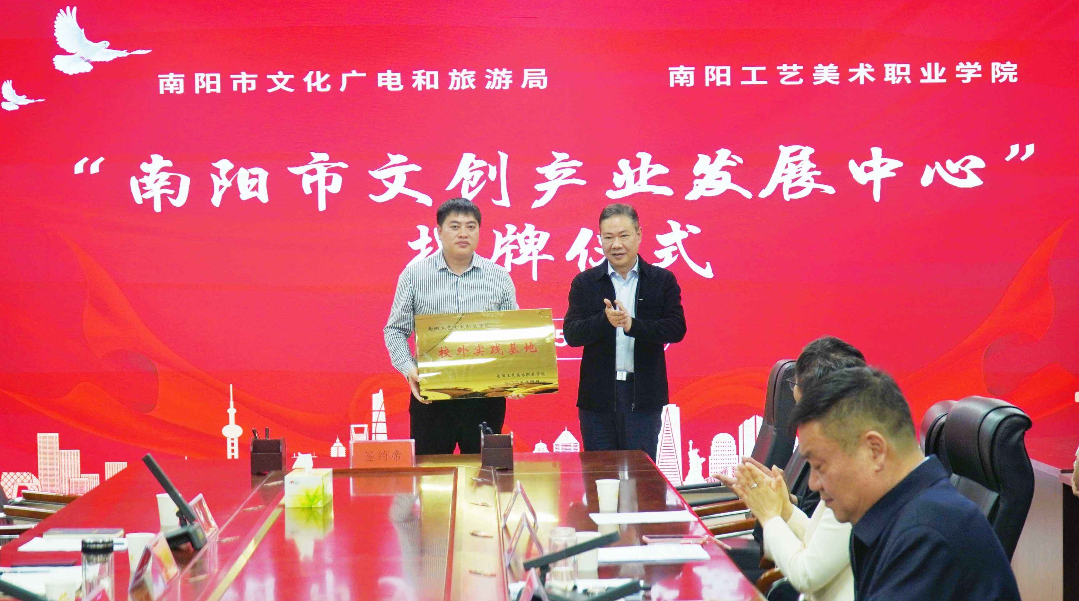 4月8日,“南阳市文创产业发展中心”签约仪式暨揭牌、授牌仪式于我校举行。南阳市文化广电和旅游局党组书记、局长任永亮、产业发展科科长刚明哲,镇平县文化广电和旅游局党组书记、局长许冰,南阳市文化旅游发展服务中心主任杨源,南阳礼物文化发展有限公司董事长李晖,校党委书记赵毅辉、校长胡楠、副校长李艳丹等出席仪式,产品设计学院相关负责人列席仪式。