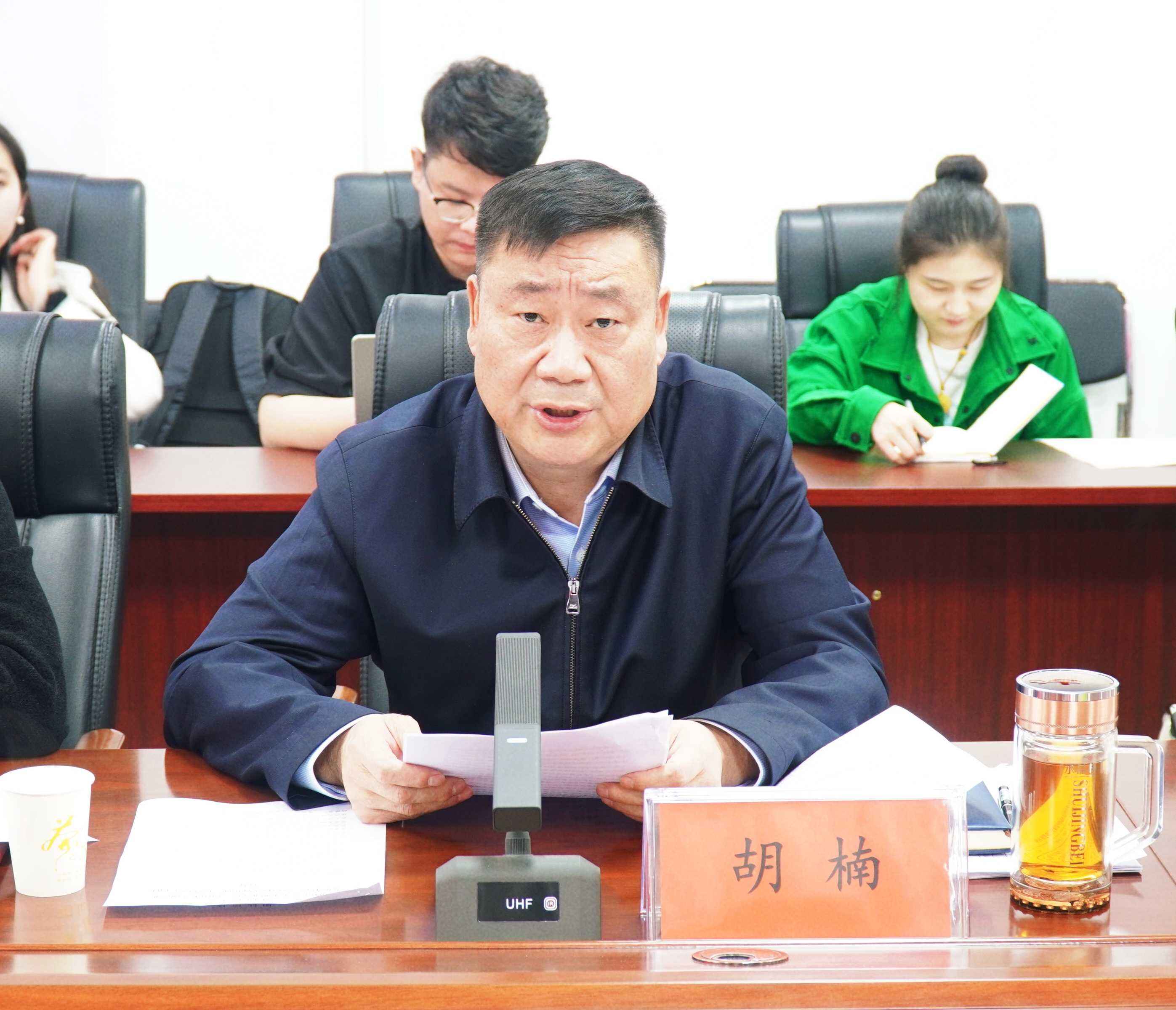 仪式上,校长胡楠致欢迎辞。他对长期支持学校发展的各界领导及企业表示感谢,并深入介绍了我校的办学成果及优势。他强调,此次三方共建文创产业发展中心,是落实习近平总书记“将传统文化资源转化为发展优势”重要指示的实践举措,将通过订单式人才培养、项目化产品研发,整合楚汉文化、玉雕技艺、中医药文化等资源,推动文创产业链与职教链有机衔接,为传承创新地域文化、赋能产业升级提供人才与智力支撑。
