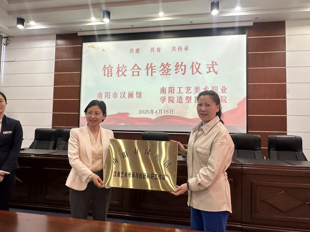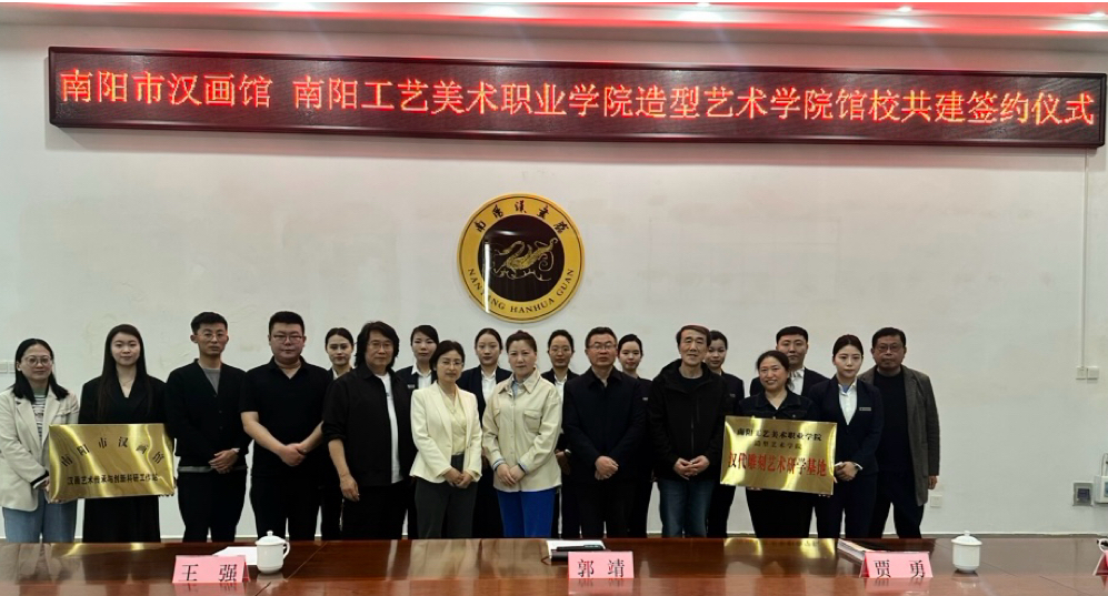 在双方代表的见证下,南阳市汉画馆副书记郭靖与南阳工艺美术职业学院副校长李艳丹签署校馆合作基地协议;双方领导共同为“南阳工艺美术职业学院造型艺术学院共建校馆合作基地”牌匾揭牌。仪式圆满结束后,南阳工艺美术职业学院的各位领导和老师们参观了南阳市汉画馆。