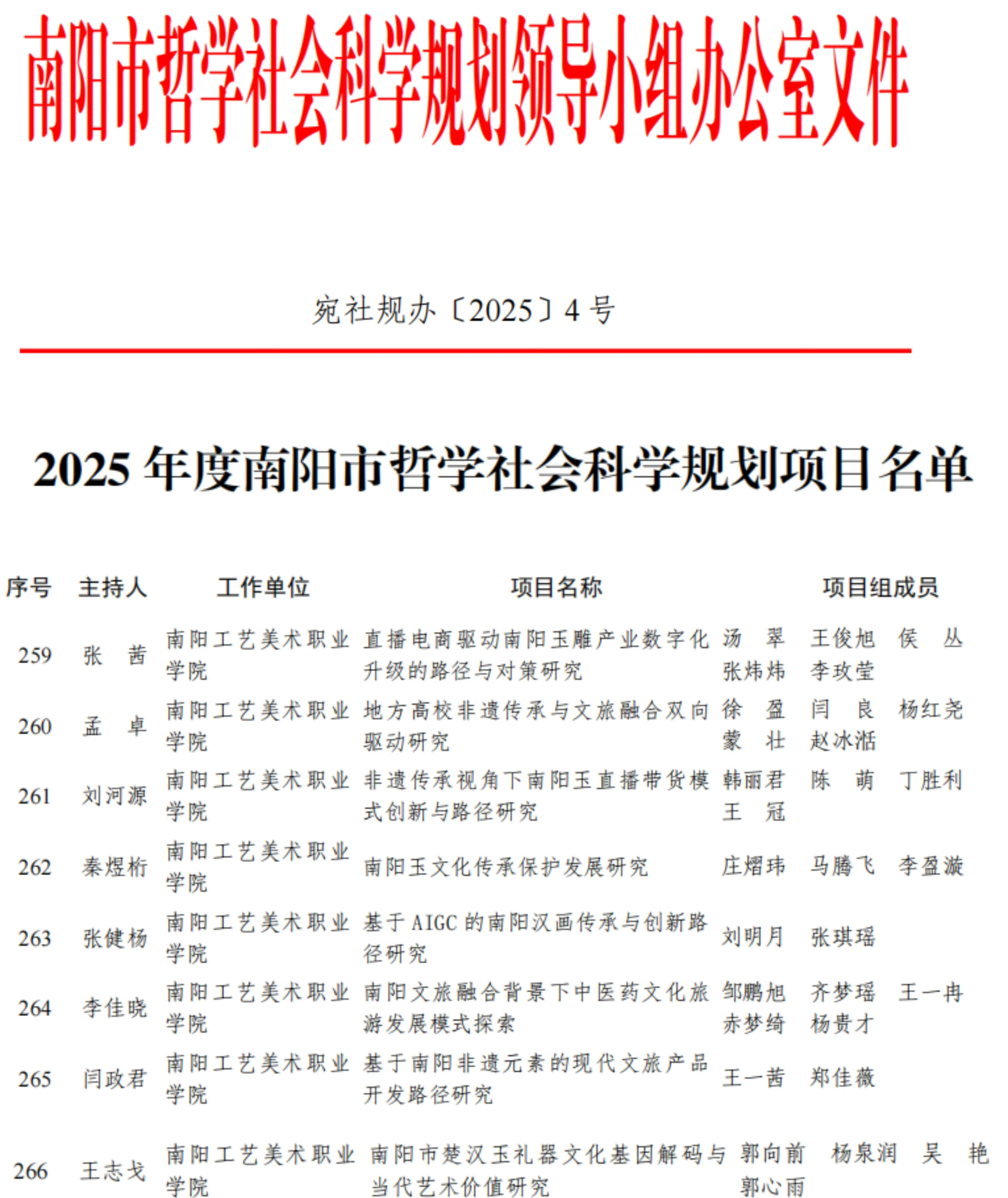 近日,2025年度南阳市哲学社会科学规划项目立项结果公布,我校《直播电商驱动南阳玉雕产业数字化升级的路径与对策研究》等8项课题获批立项,课题涵盖玉雕产业、地方文旅融合等方向,研究内容紧密对接南阳经济社会发展需求。