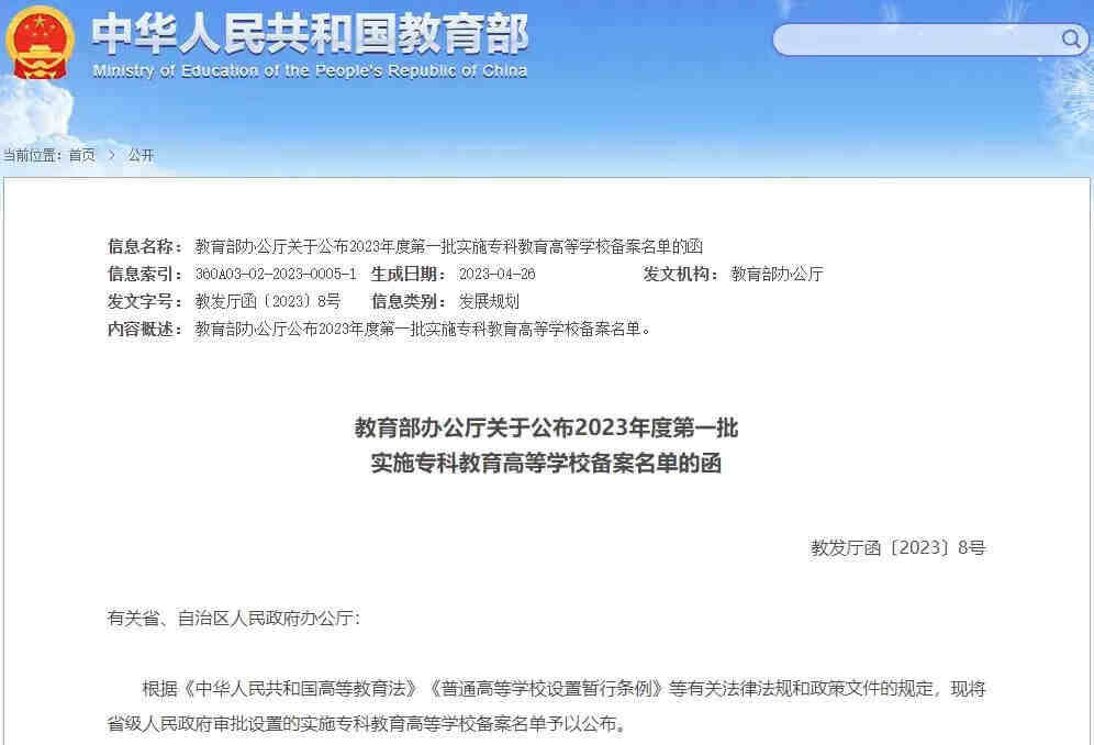 教育部公布2023年度第一批实施专科教育高等学校备案名单