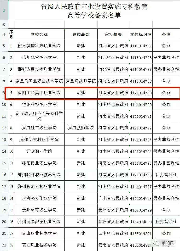 河南省人民政府关于设立南阳工艺美术职业学院等9所高校的通知