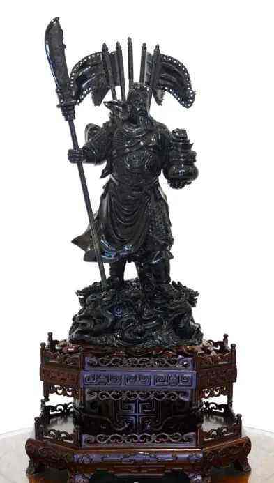 创作说明:作品为和田玉青玉料,以威仪关公为核,融五面旌旗、龙纹大刀、福禄葫芦及九龙绕足等祥瑞元素。关公持青龙偃月刀镇财帛,九龙吐珠纳吉气,五旗招展聚五方财源,葫芦纳福消灾。整器以忠义仁勇之姿,融入传统文化中"九五至尊""珠联璧合"等吉意,刚柔并济间既显武圣护财之威,又蕴福寿绵延之愿,堪称招财纳祥之臻品。
