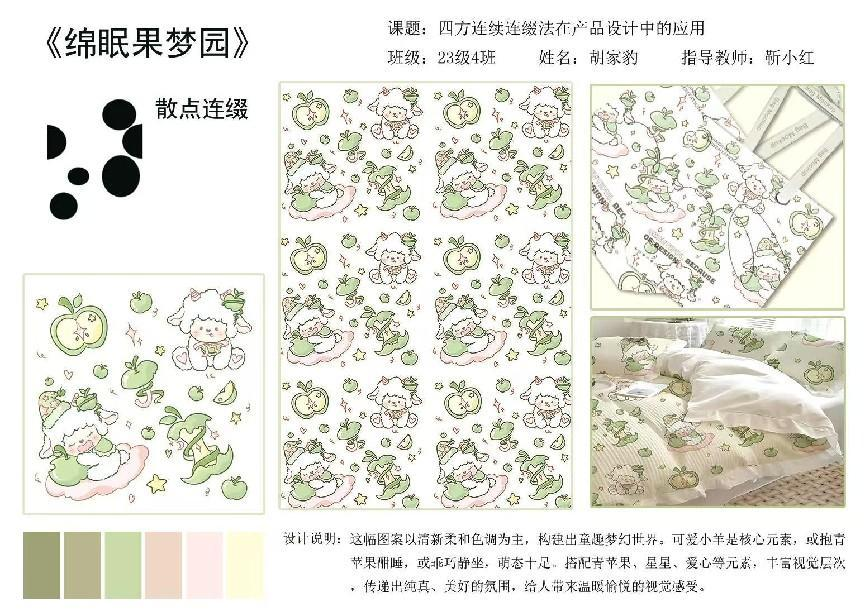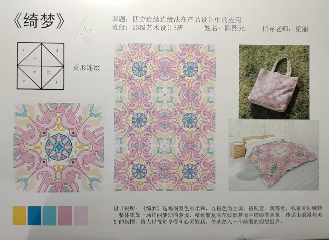 学习装饰图案的过程,像是推开了一扇通往美学新世界的大门。最初面对繁复的纹样,只觉眼花缭乱,不知从何下手。但随着课程深入,我渐渐领悟到,那些看似复杂的图案,实则是秩序与创意的完美融合。每一次灵感迸发,每一回反复修改,都让我感受到艺术创作的魅力。装饰图案不仅提升了我的审美能力,更教会我用独特的视角去发现美、创造美,这将成为我艺术道路上宝贵的财富。