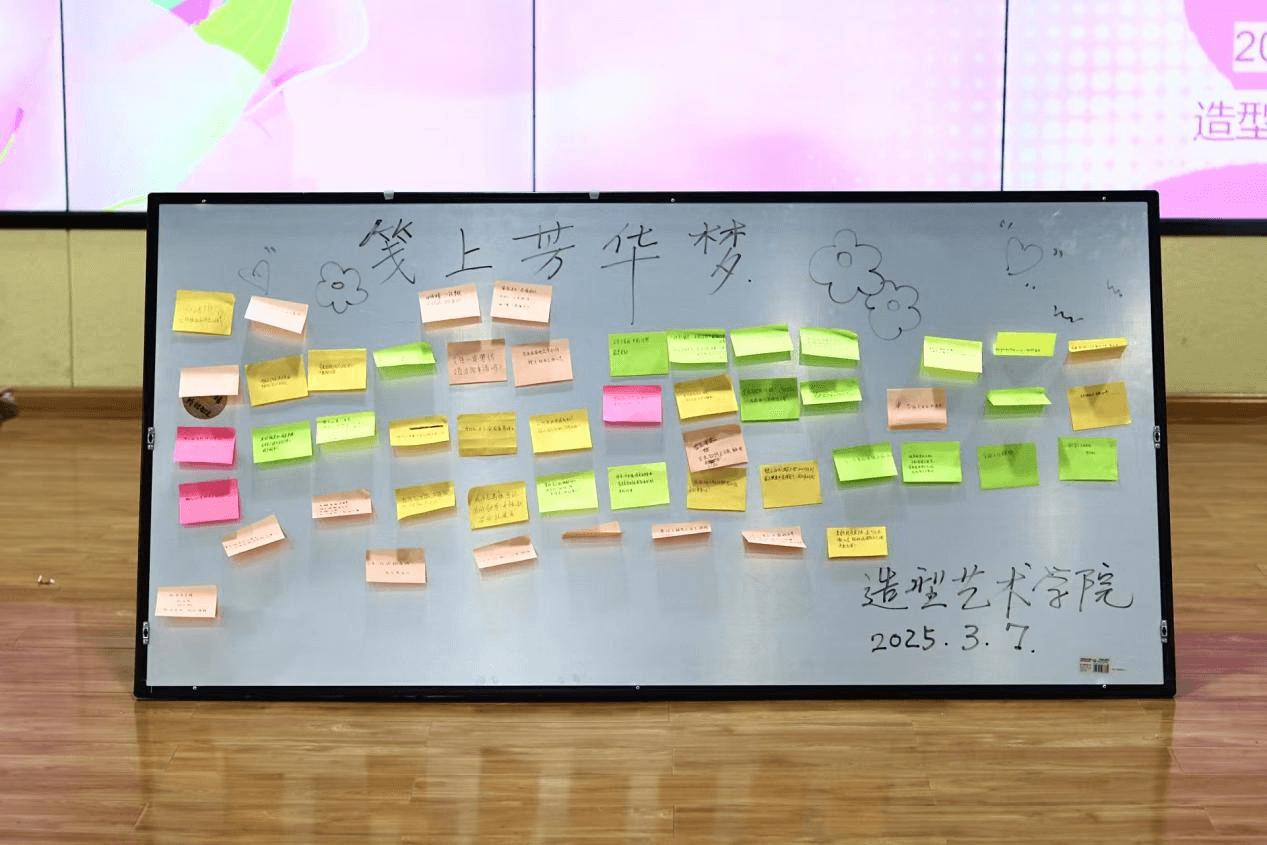 在“笺上芳华梦”环节,同学们用五彩便签汇聚成“梦想之墙”,学生将未来期许化作文字,发出“不被定义,自由生长”的青春宣言,展现了造型艺术学院学子对未来的期望与坚定。