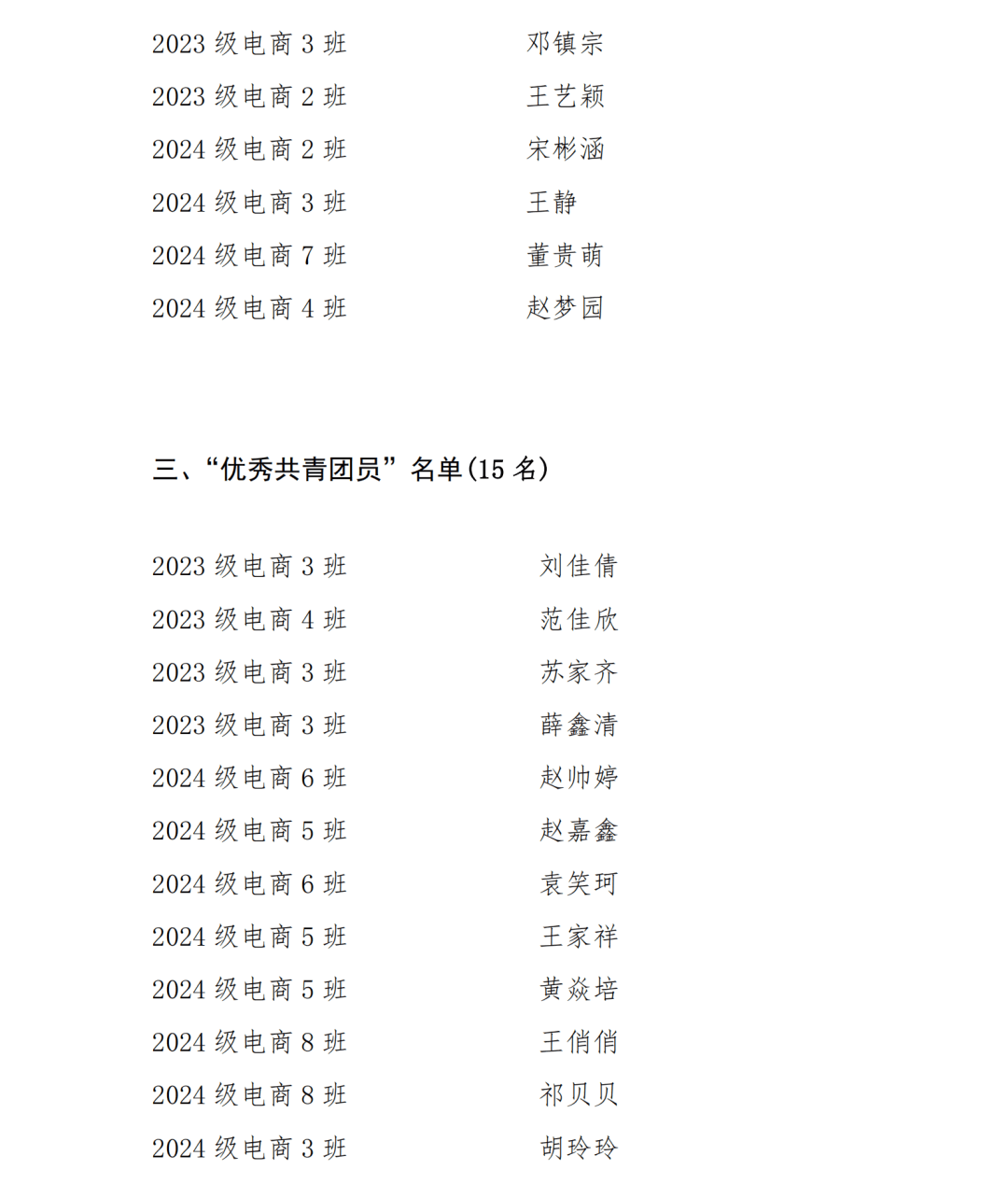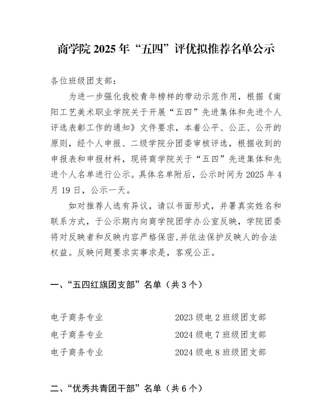 2024-2025学年,南阳工艺美术职业学院商学院学生工作以习近平新时代中国特色社会主义思想为指导,以立德树人为根本任务,以理想信念教育为核心,积极引导青年学生践行社会主义核心价值观,鼓励和支持大学生实行自我管理、自我服务、自我教育和自我监督,涌现出一大批先进集体和先进个人,充分展现了当代大学生健康向上的精神风貌。现予推荐(名单附后)。