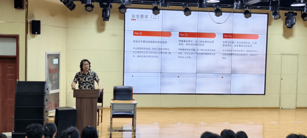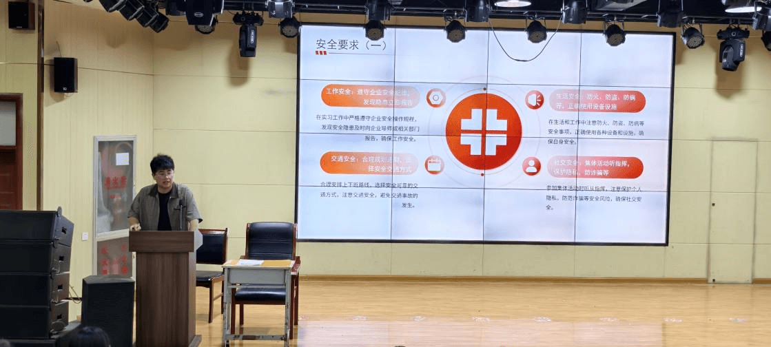 随后,学院实习实训负责人闫政君老师围绕“实习纪律、安全与材料提交”三方面进行了深入解读。他指出,岗位实习既是学生职业素养的展示平台,也是培养职业规范、增强社会责任感的重要载体。在纪律方面,他强调学生在岗期间必须严格遵守用人单位和学院的双重管理制度,杜绝迟到早退、擅自离岗等不良行为;在安全方面,闫政君老师就交通、食宿、防诈骗等常见安全问题进行了案例式提醒,强化了学生的风险意识和自我防护能力。
