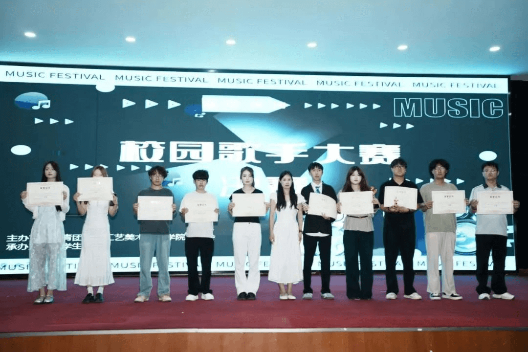 颁奖环节,校团委李玥瑶老师为获奖选手颁发荣誉证书与定制奖杯并一同合影留念。这份荣誉是对音乐热爱的肯定,更将化为选手们未来逐梦音乐的动力,继续用歌声讲述青春故事!