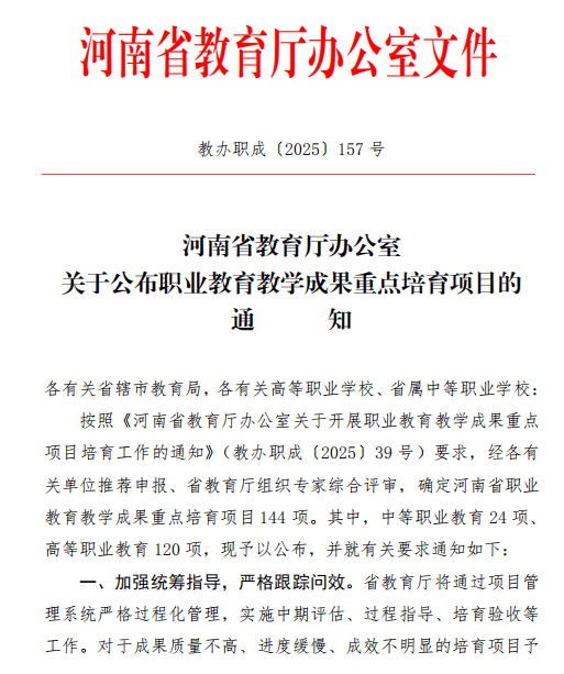据悉,此次按照《河南省教育厅办公室关于开展职业教育教学成果重点项目培育工作的通知》(教办职成{2025}39号)要求,经各有关单位推荐、省教育厅组织专家综合评审,确定河南省职业教育教学成果重点培育项目144项。此次立项标志着我校在职业教育教学改革领域的科研实力再获认可,为学校高质量发展增添了新动能。