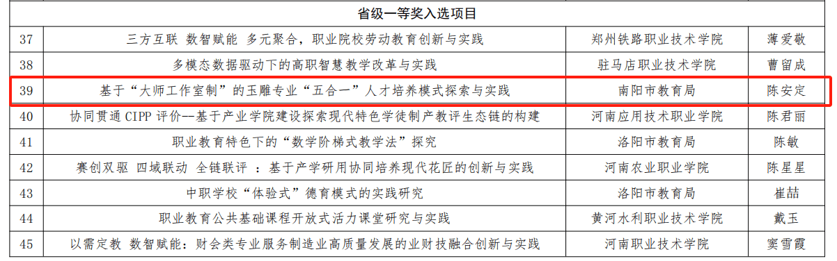 近日,河南省教育厅公布了《河南省教育厅办公室关于公布职业教育教学成果重点培育项目的通知》(教办职成〔2025〕157号),我校珠宝玉雕学院陈安定老师主持的科研课题《基于“大师工作室制”的玉雕专业“五合一”人才培养模式探索与实践》(项目编号:{2024}50413号)成功获批立项。