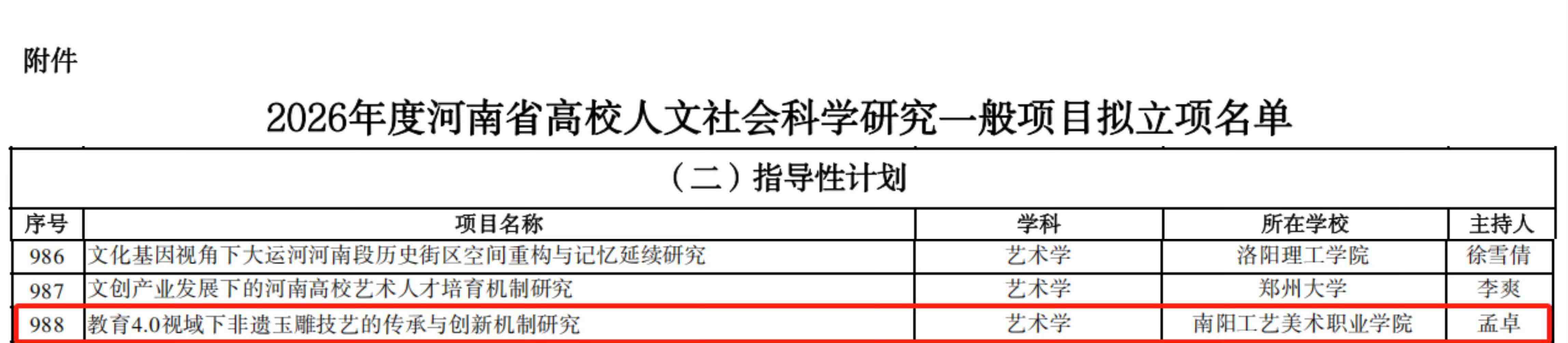 近日,河南省教育厅公布了2026年度河南省高校人文社会科学研究一般项目立项名单,我校申报的《教育4.0视域下非遗玉雕技艺的传承与创新机制研究》成功获批立项。