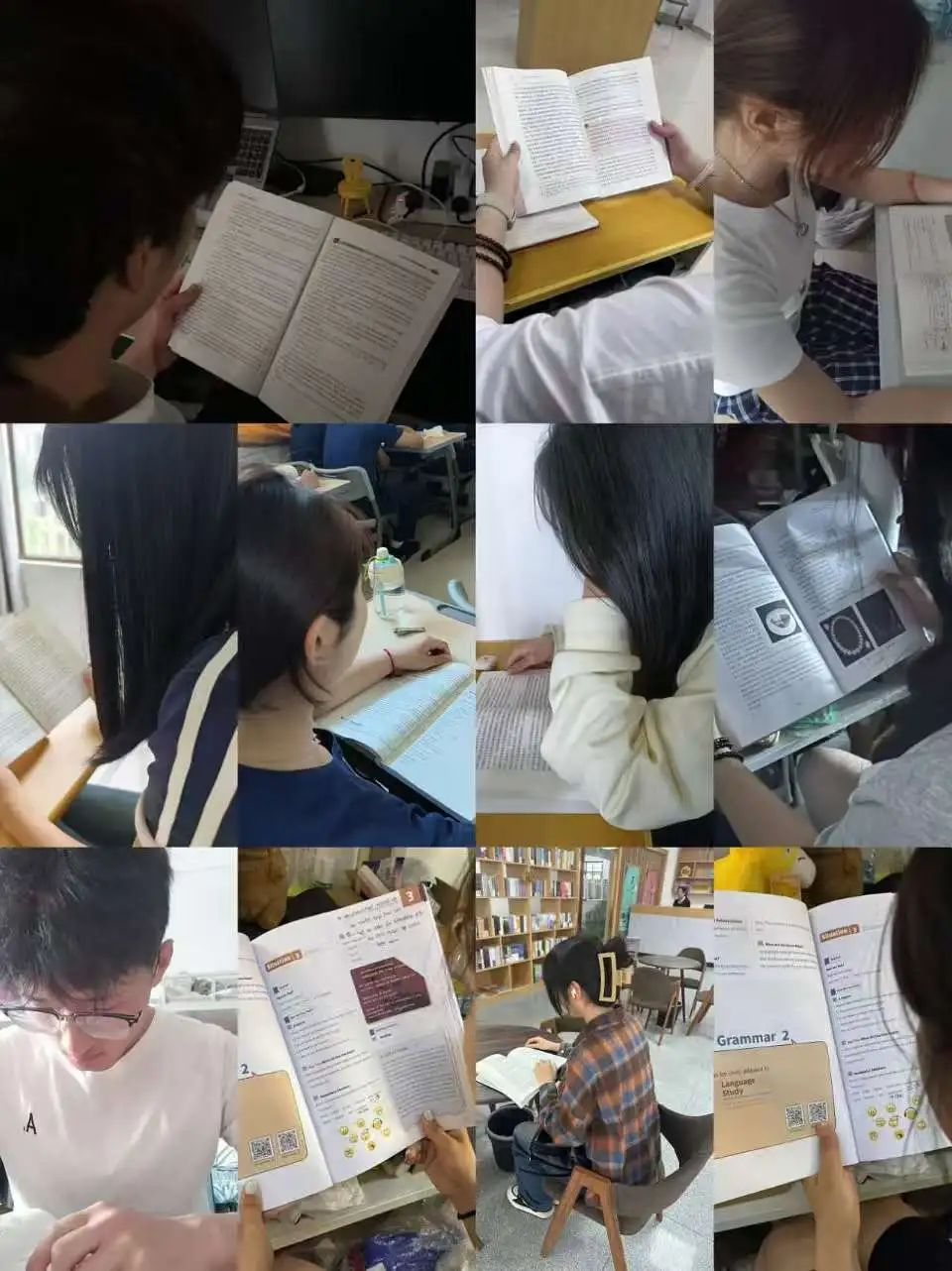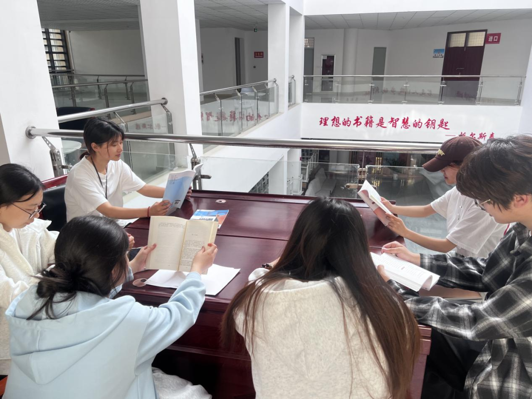 图书馆的回廊处,几位同学围坐在圆桌旁,专注地阅读手中的书籍,时而相互交流探讨书中的精彩段落,思想的火花在交流中不断碰撞。他们沉浸在书籍的世界里,仿佛忘记了周围的一切。