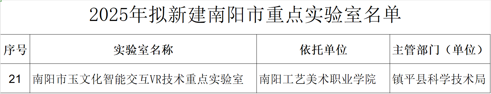 根据《南阳市科技创新平台建设与管理办法》(宛科〔2018〕8号)和《南阳市重点实验室建设与运行管理办法》(宛科〔2024〕9号)要求,经市科技局组织审核推荐、专家评审及实地考察,我校申报的学科类重点实验室《南阳市玉文化智能交互VR技术重点实验室》成功入选2025年南阳市重点实验室建设名单(全市共批复建设22家)。