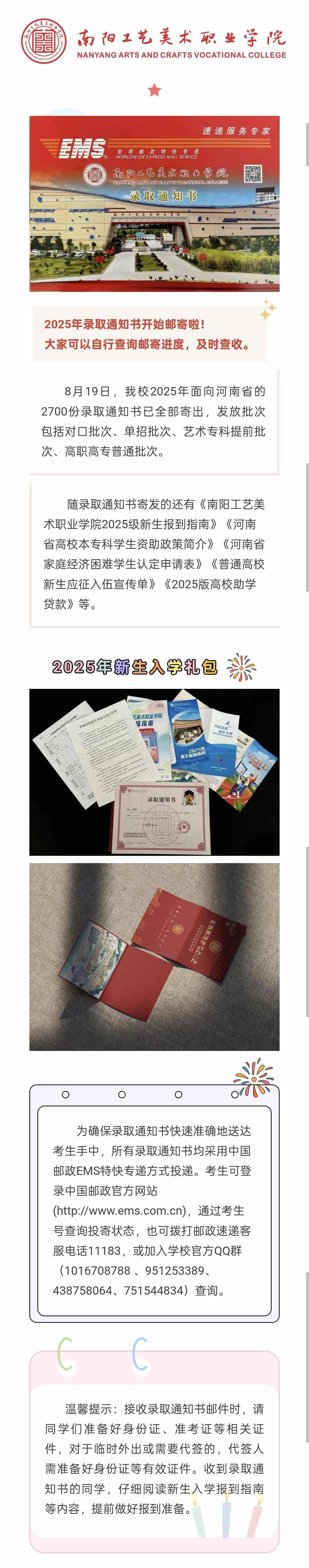 南阳工艺美术职业学院2025年录取通知书已邮寄