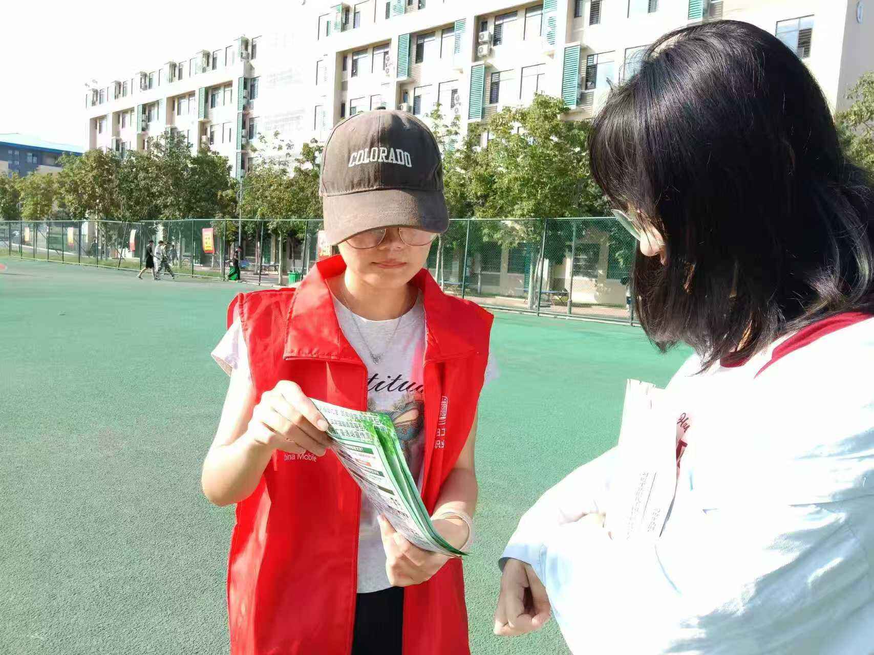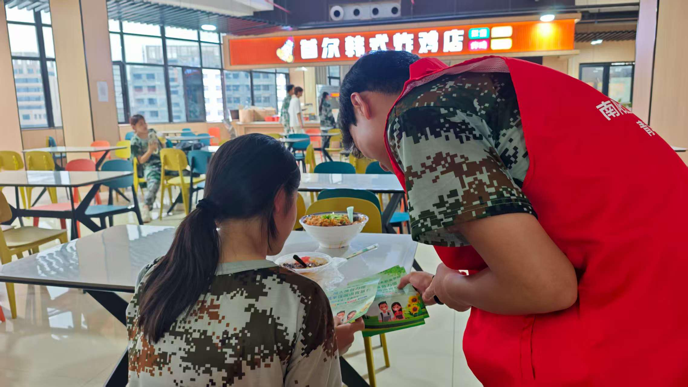 在学生食堂区域,志愿者们设立了简单的宣传点。他们通过发放宣传单,向前来就餐的同学们耐心讲解说好普通话的重要性,并鼓励大家在日常交流中主动使用普通话,让规范用语成为日常生活中一种自然而然的习惯。