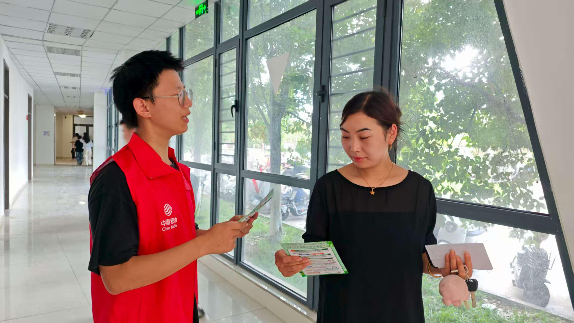 在教学楼的走廊和通道处,志愿者们利用课间时间向过往老师和同学分发宣传单,结合传单内容提醒大家在课堂学习和课余交流中时刻注意语言规范,潜移默化地提升语言素养。
